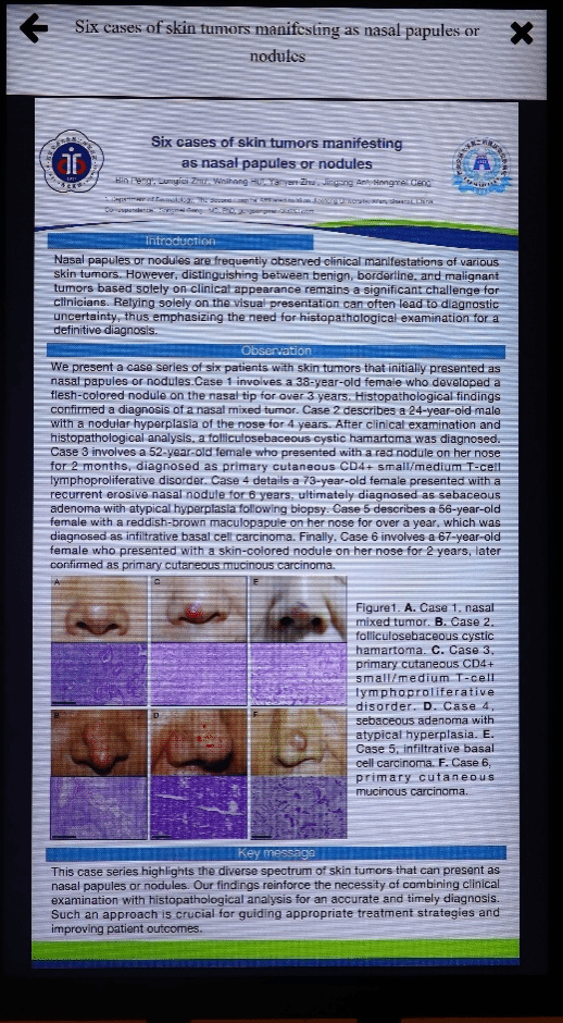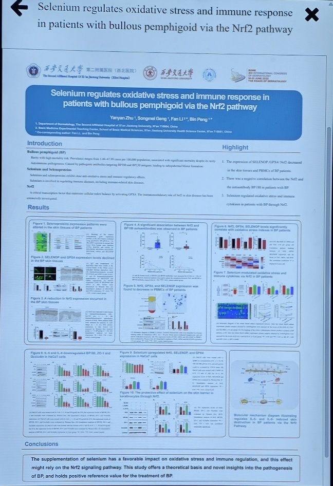 彭斌博士的壁报题目“Six cases of skin tumors manifesting as nasal papules or nodules’’。该研究聚焦以鼻部丘疹或结节为首发表现的皮肤肿瘤。皮肤检验团队骨干成员朱艳艳硕士的壁报题目“Selenium regulates oxidative stress and immune response in patients with bullous pemphigoid via the Nrf2 pathway’’旨在探究硒对BP患者氧化应激和免疫反应的调控及相关机制。