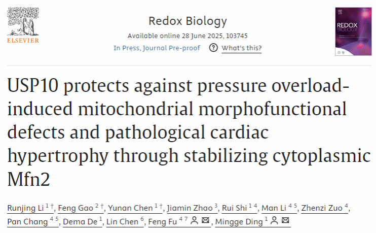 近日,老年心血管科丁铭格教授团队在心力衰竭治疗领域取得重要进展。团队首次揭示了去泛素化酶USP10通过稳定线粒体融合蛋白Mfn2,保护心肌细胞免受压力超负荷诱导的病理性肥厚和心功能损伤。该研究成果以“USP10 protects against pressure overload-induced mitochondrial morphofunctional defects and pathological cardiac hypertrophy through stabilizing cytoplasmic Mfn2”为题,发表于氧化还原生物学领域权威期刊《Redox Biology》(影响因子:11.9)。这是该团队继在《Cell Metabolism》发表重要成果后,在心衰研究领域取得的又一标志性进展。