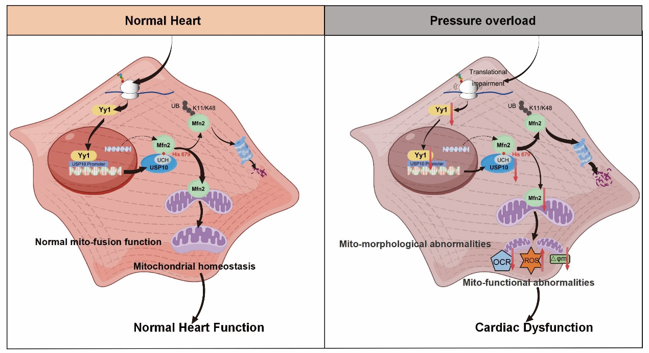 心力衰竭是全球心血管疾病死亡的主要原因之一,而病理性心肌肥厚是其重要病理基础。越来越多的证据表明,线粒体形态和功能缺陷在心肌肥厚向心力衰竭的转变中起关键作用。然而,线粒体形态功能缺陷的调控机制尚未完全阐明。研究团队发现去泛素化酶USP10在病理性心肌肥厚向心衰转变过程中显著下调,且与心衰标志物BNP水平呈负相关,恢复USP10表达减少线粒体碎片化,改善线粒体和心脏功能。进一步的机制研究发现,USP10可结合细胞质中的Mfn2,通过其679位组氨酸介导的去泛素化作用,去除Mfn2的K11/K48泛素链,抑制其被蛋白酶体降解,增强Mfn2稳定性,促进其向线粒体的转运,从而维持线粒体的形态与功能。本研究首次揭示了USP10在增强线粒体蛋白Mfn2稳定性中的调控机制,该过程发生在Mfn2转运到线粒体之前,表明USP10可能作为保护线粒体功能和预防病理性心肌肥厚的新靶点。