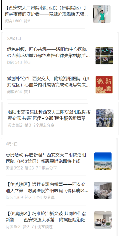 1、在院内宣传平台等平台发布宣传内容10余条,6月由洛阳市卫健卫指导拍摄的《洛医汇•宝藏医生》顺利播出。节目展示了王伟教授扎根洛阳、服务区域中心建设的工作记录。