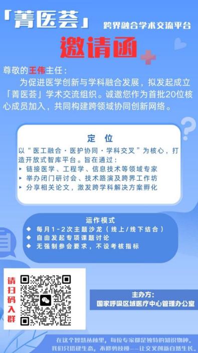 计划开展“伊滨菁医会”系列活动:首批邀请20位核心成员加入,以“医工融合·医护协同·学科交叉”为核心,打造开放式智库平台。旨在通过链接医学、工程学、信息技术等领域专家,举办闭门研讨会、技术路演及跨界工作坊,分享相关论文,激发跨学科解决方案孵化。每月1-2次主题沙龙(线上/线下结合)自由发起专项课题讨论,跨界碰撞解决临床问题。