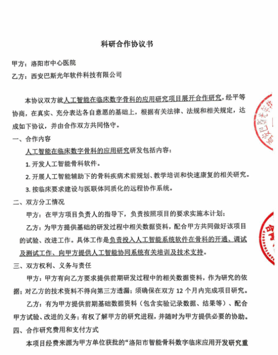 医院以骨科为试点,与西安巴斯光年软件科技有限公司签订合作协议,引进智慧医务系统与远程诊疗系统,并合作开发人工智能骨科软件,人工智能辅助下骨科疾病术前规划、教学培训及快速康复的研究等功能,近期硬件设备将到位,即将开始相关工作。
