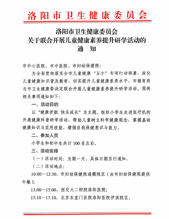 确定开展儿童健康素养提升研学活动,经过洛阳医院与洛阳市卫健委积极沟通,洛阳市卫健委发布了儿童健康素养提升研学活动的通知,将活动升级为洛阳市卫健委系统与洛阳市教育局系统的主要工作。活动将以“健康护航快乐成长”为主题,组织小学生100-150名走进医疗机构开展健康科普研学活动,帮助儿童树立科学健康观念,掌握基础健康知识与实用技能,增强自我保健意识与能力。