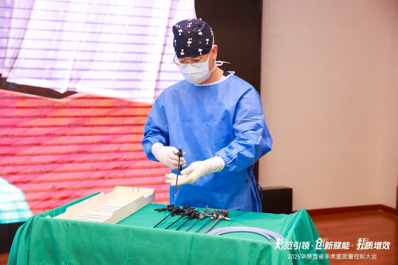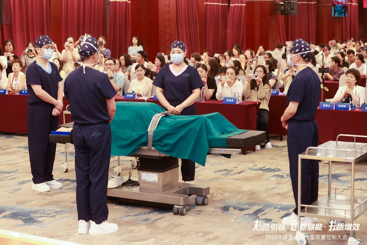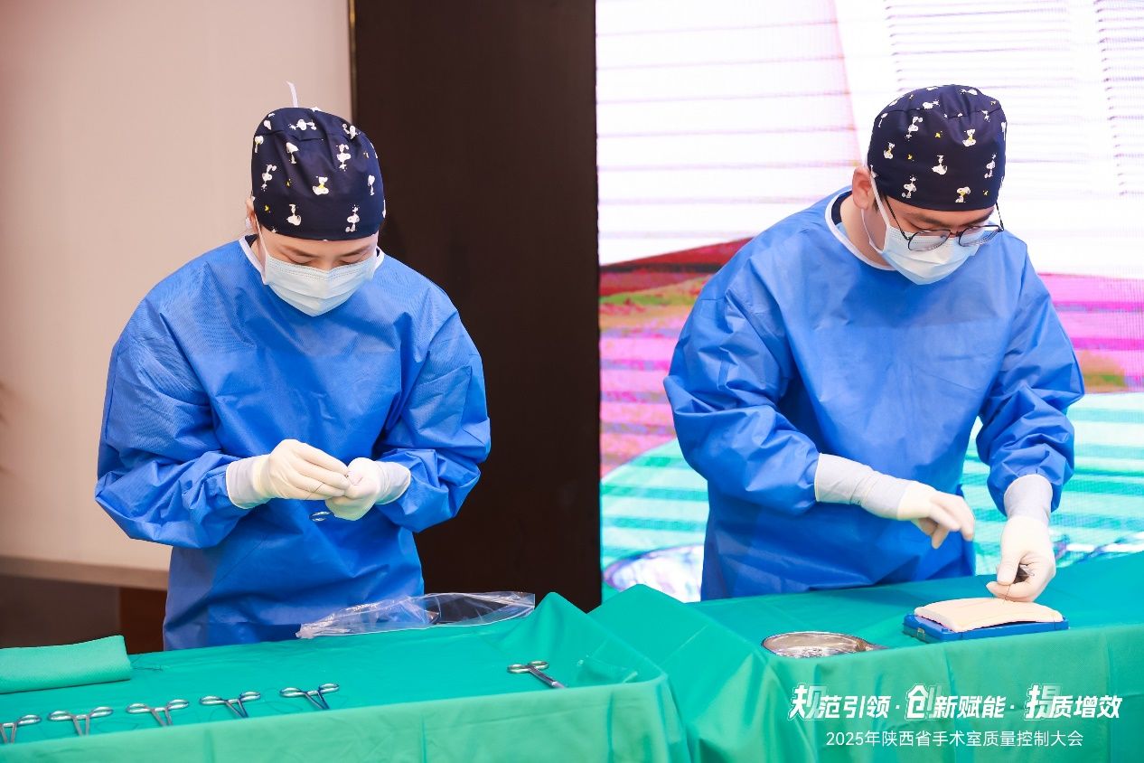 本次会议不仅是一次知识的传递,更是一场规范与卓越的生动实践,会议匠心独具的设置了现场演示环节:穿针引线、手术缝合、腔镜器械安装、标准化手术体位安置(平卧位、截石位、俯卧位、侧卧位以及术中不同体位转换)、侧卧位手术铺巾等核心操作流程。由交大二院手术室护理团队——姚洋、刘儒忠、樊天乐、李棪臻、张庚、张森渊、杨于瑶等骨干成员联袂呈现。他们以近乎艺术化的精准与流畅,其动作行云流水、毫厘不差,团队配合天衣无缝、默契无间,这不仅是一场技艺的展示,更是陕西省手术室护理操作规范化、标准化、同质化的标杆性示范,为全省同仁树立了可学习、可复制、可推广的实践典范,深刻诠释了“精益求精”的专业内涵。