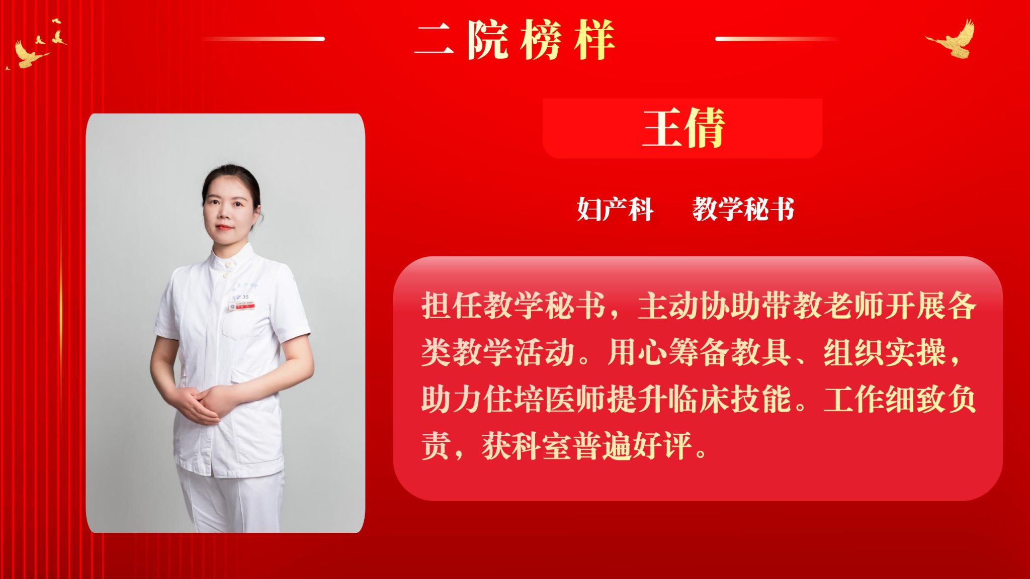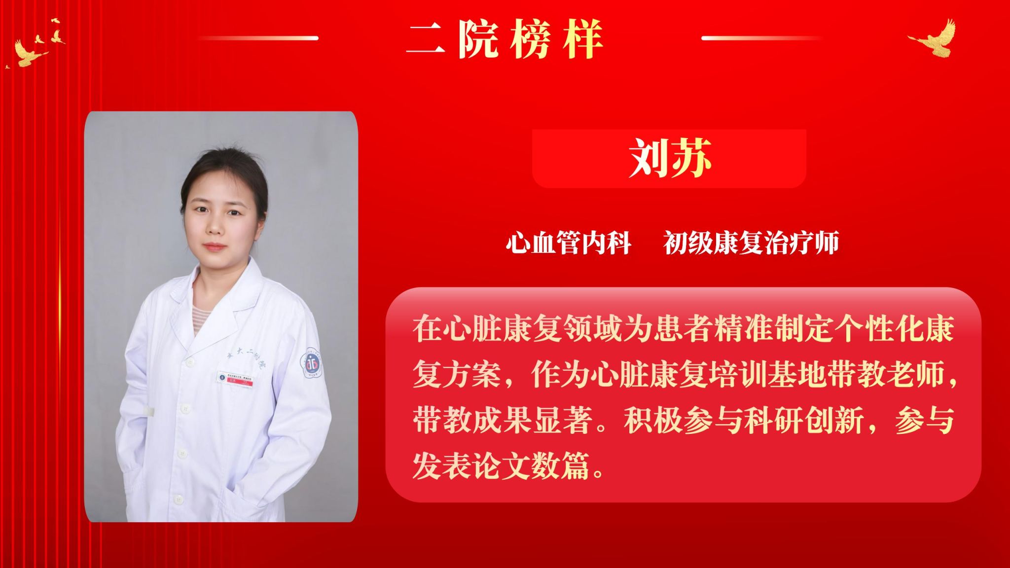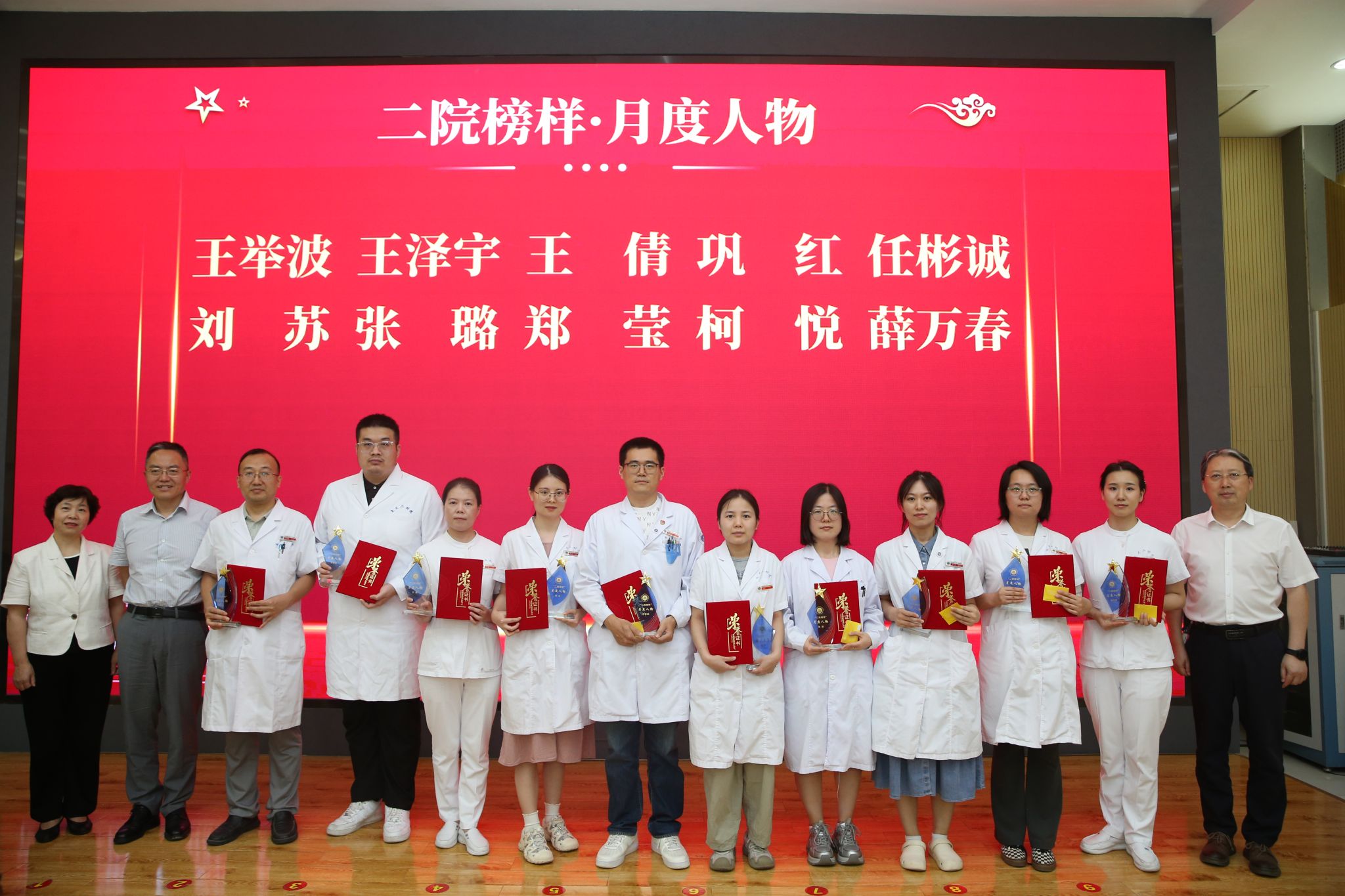 仰望星空有对标,脚踏实地有行动,平凡的是岗位,不凡的是精神。此次“二院榜样”月度人物共评选出10名,他们分别是:神经外科副主任医师王举波、麻醉手术科护士王泽宇、妇产科教学秘书王倩、健康管理部住院医师巩红、风湿免疫科主治医师任彬诚、心血管内科初级康复治疗师刘苏、精准医疗研究院助理研究员张璐、消化内科住院医师郑莹、肿瘤放疗科主治医师柯悦、血液内科护士薛万春。