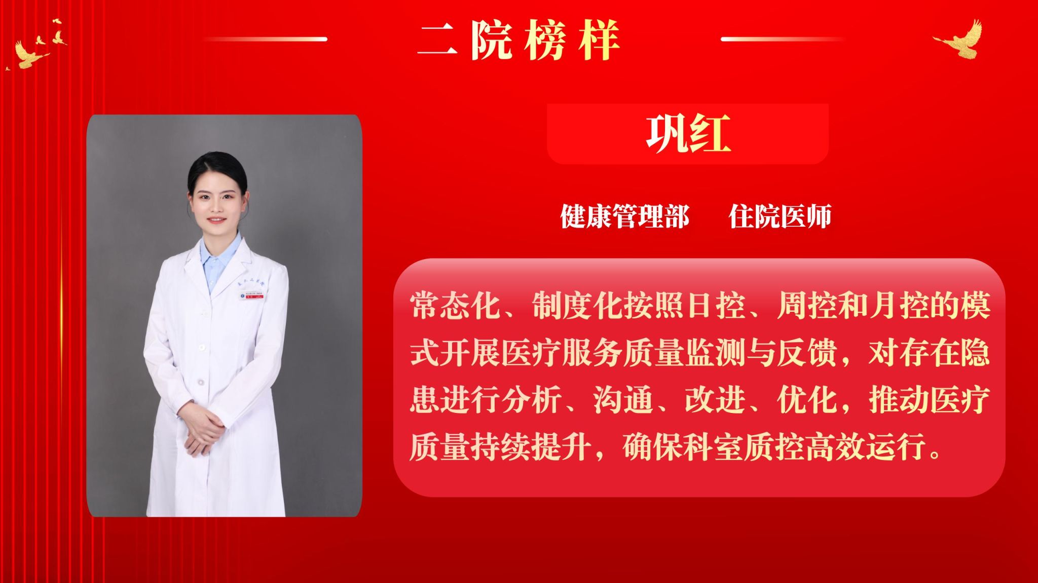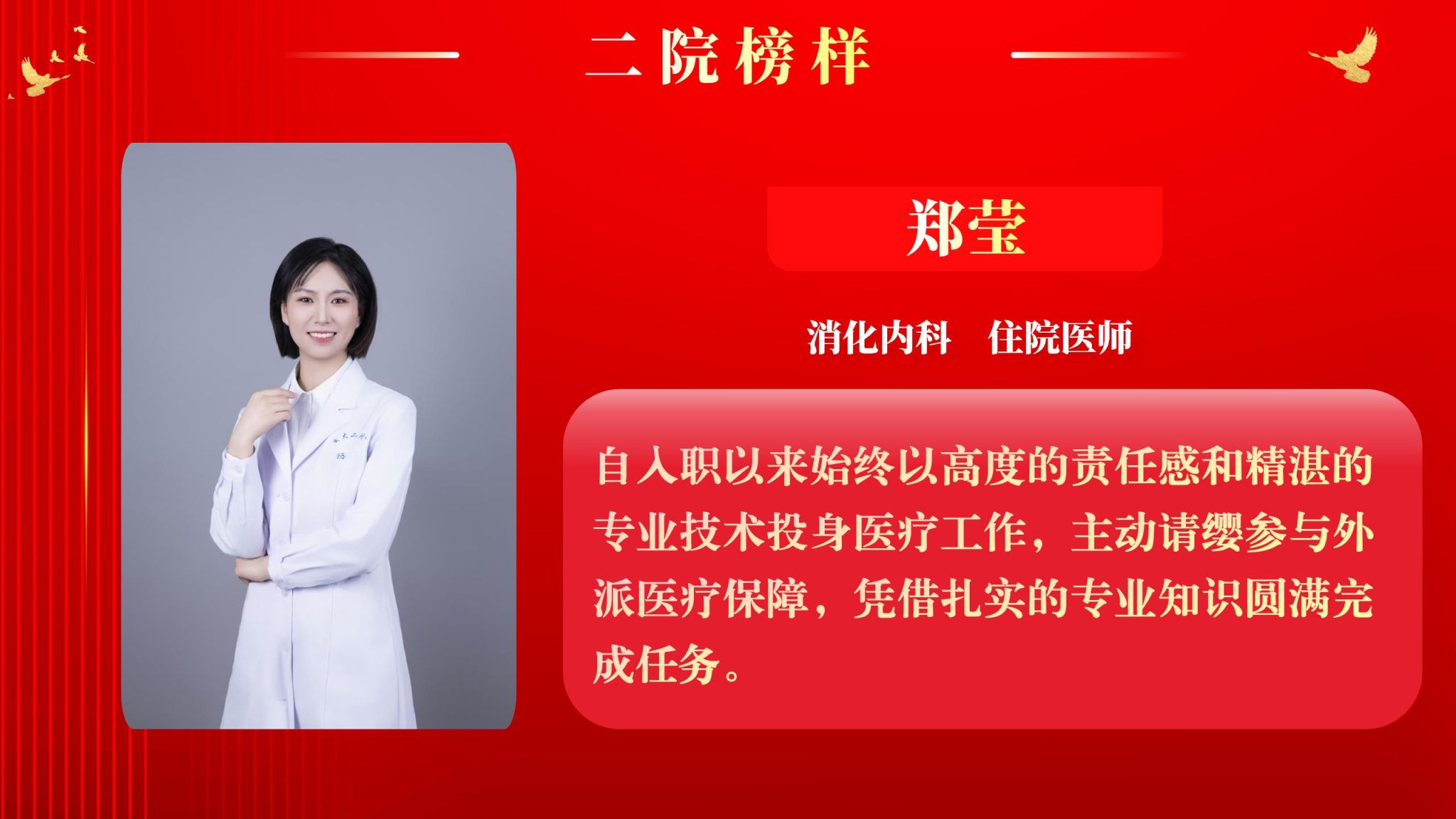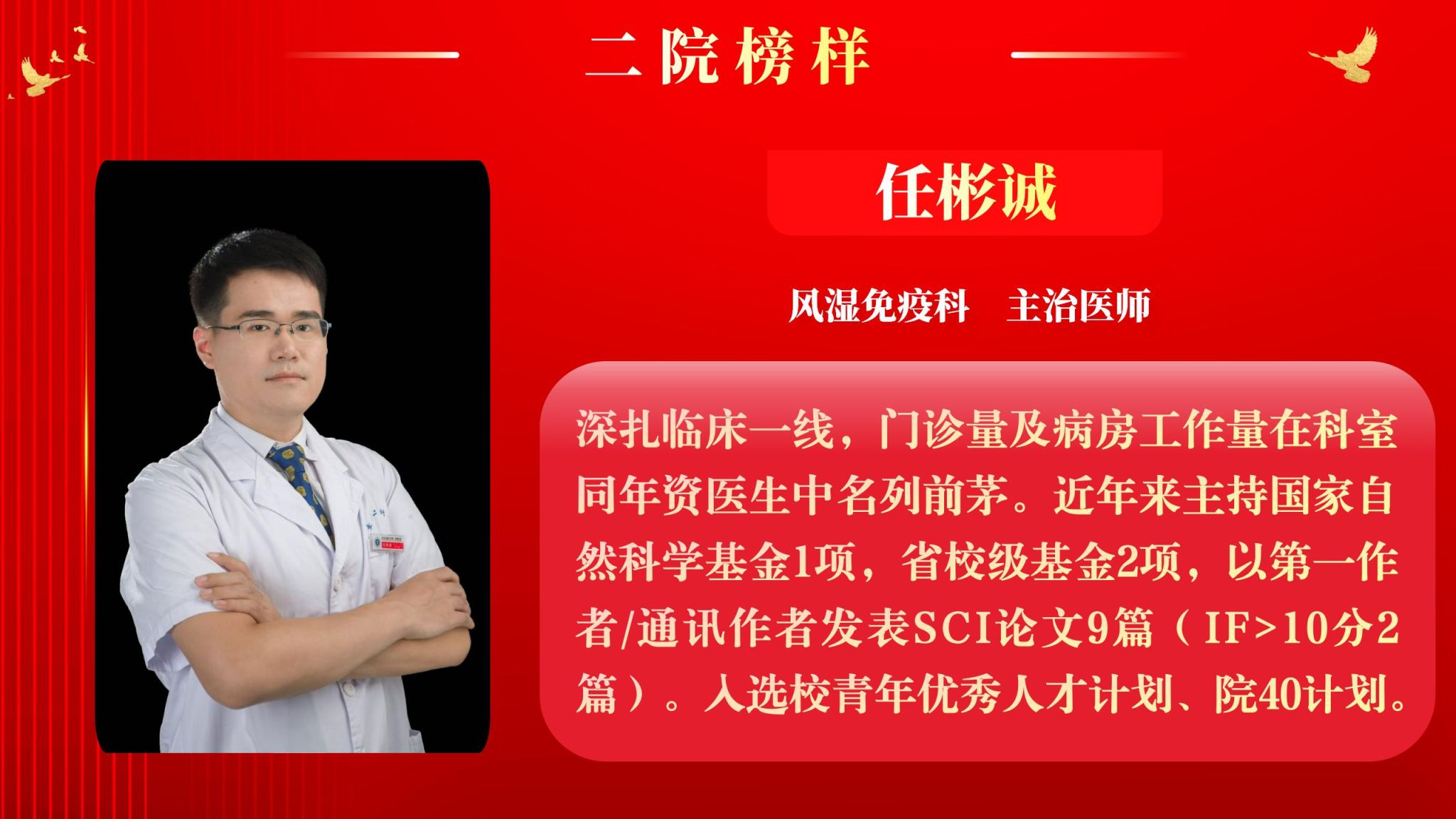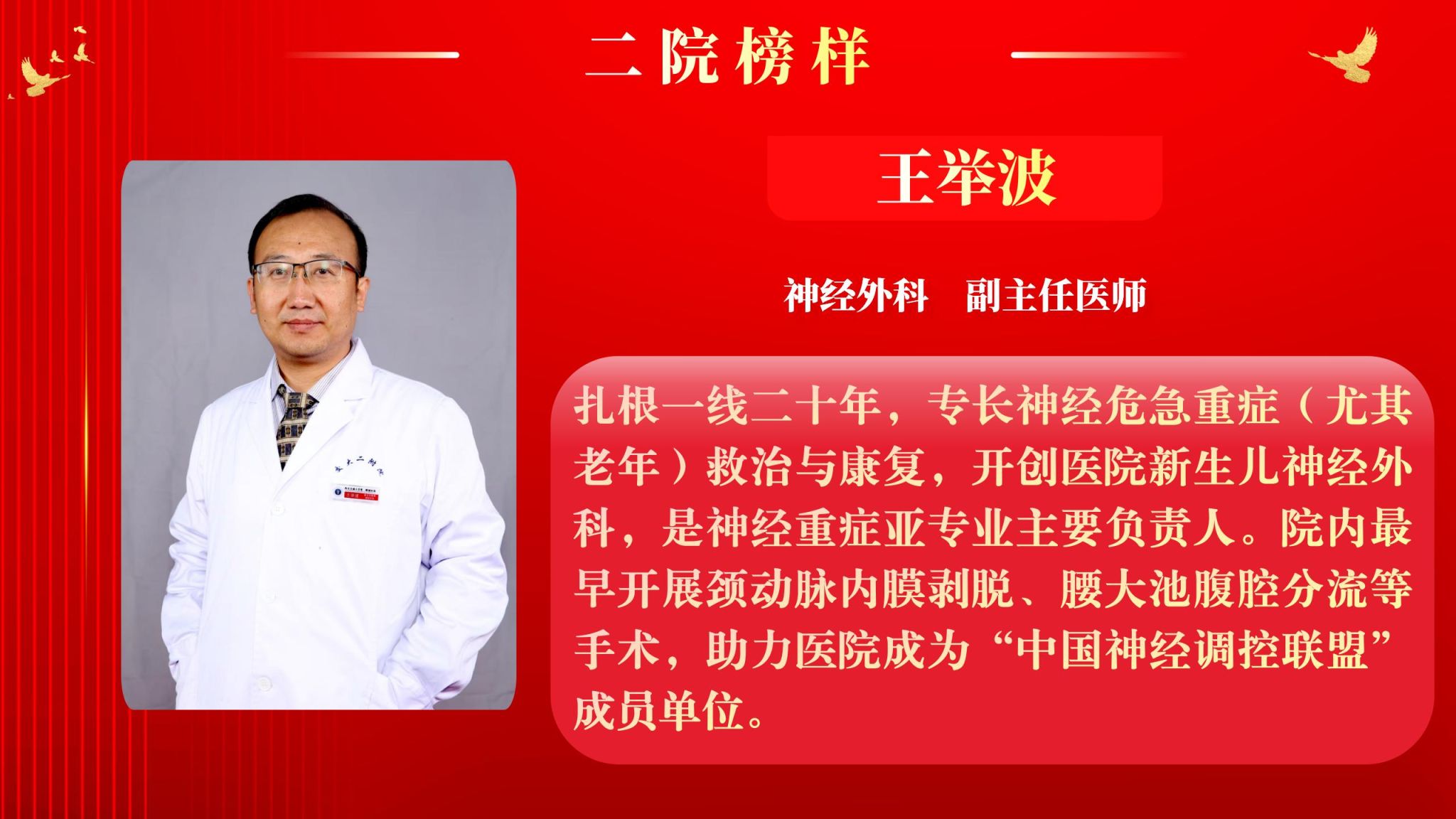 仰望星空有对标,脚踏实地有行动,平凡的是岗位,不凡的是精神。此次“二院榜样”月度人物共评选出10名,他们分别是:神经外科副主任医师王举波、麻醉手术科护士王泽宇、妇产科教学秘书王倩、健康管理部住院医师巩红、风湿免疫科主治医师任彬诚、心血管内科初级康复治疗师刘苏、精准医疗研究院助理研究员张璐、消化内科住院医师郑莹、肿瘤放疗科主治医师柯悦、血液内科护士薛万春。
