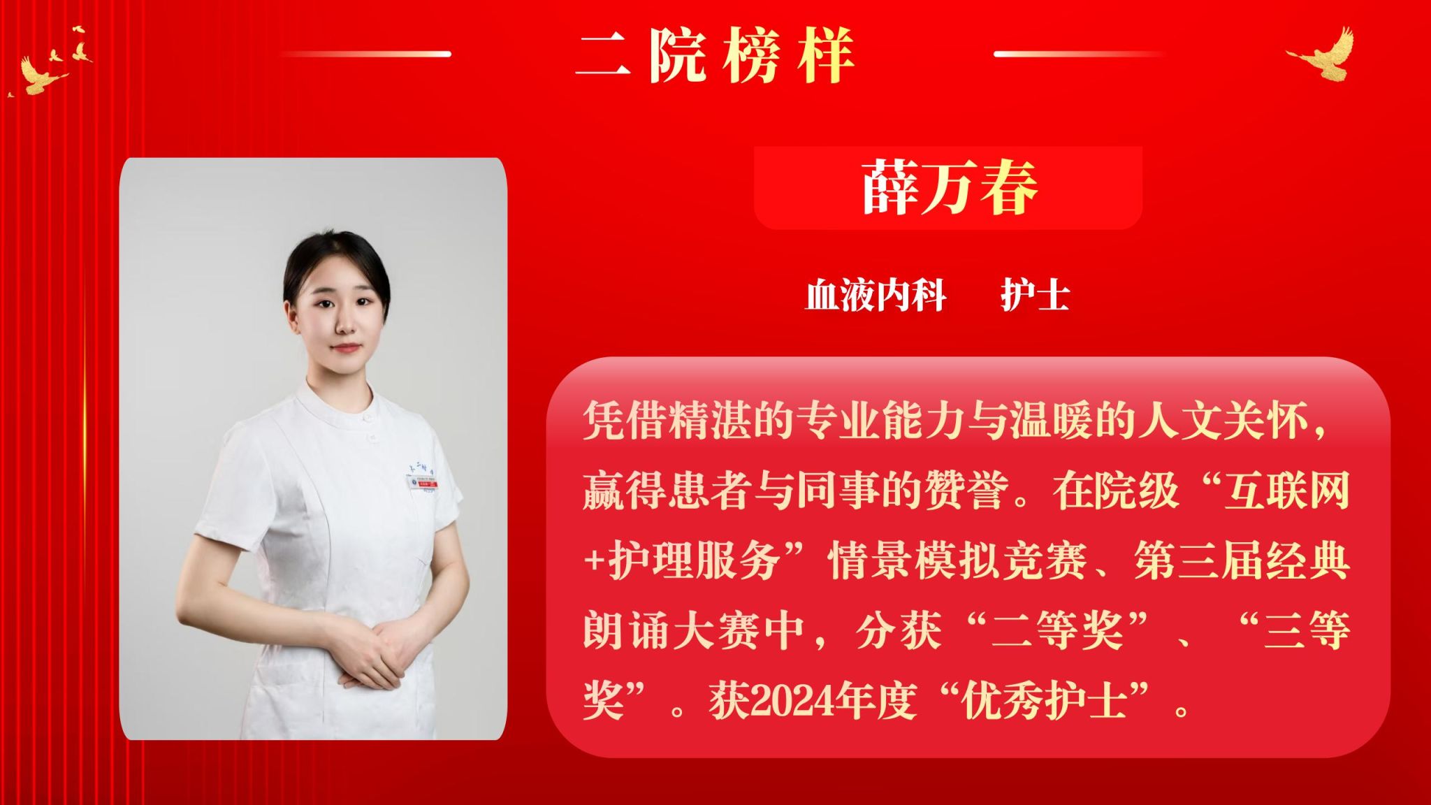 “二院榜样”评选是二附院大力传承弘扬医院优良传统,全面推进医院建设高质量发展的实际举措,通过表彰先进,激励广大教职员工学先进、赶先进、当先进,凝聚奋发兴院的强大动力。