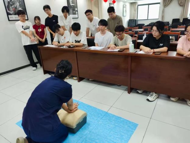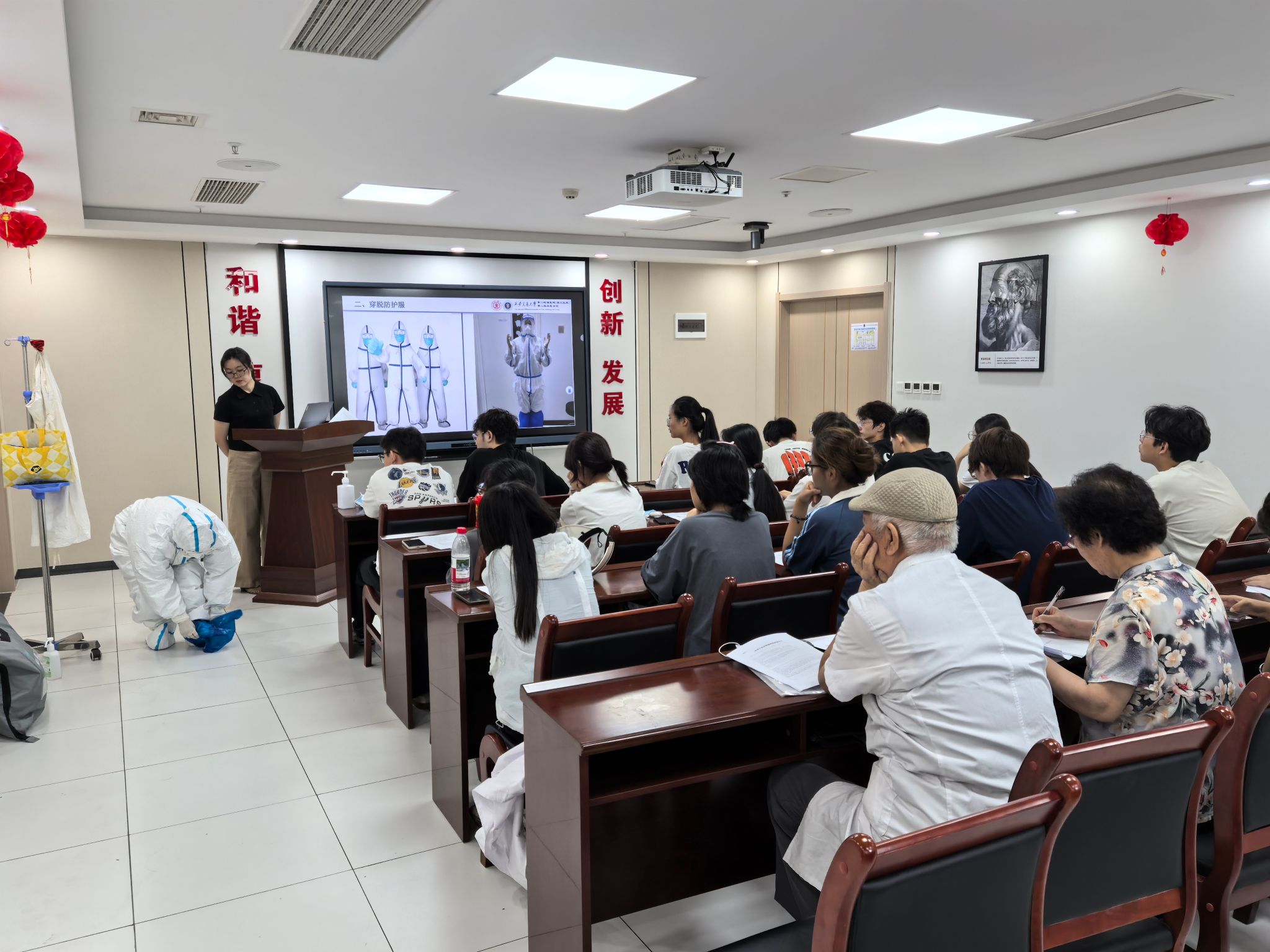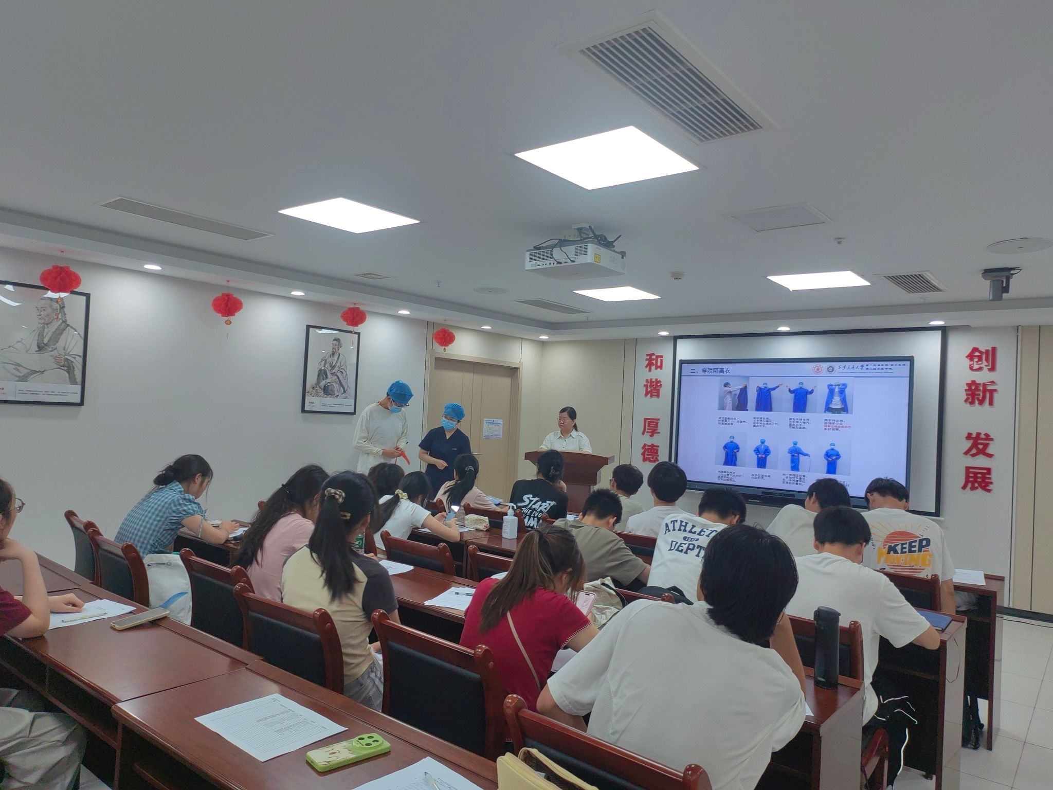 在个人防护技能培训环节,苟国娥医师、田燕医师对学生们普及传染病防治法以及模拟诊疗的实战模拟,现场学习如何报疫卡、现场演练手卫生,务实感染防控基本功。鲁瑞医师和冯丹丹医师带学生们系统学习了三级标准防护知识,并通过观看视频和实操训练,熟练掌握了穿脱隔离衣及防护服等关键技能。这些技能不仅为他们未来的临床工作筑起了一道坚实的防线,更让他们深刻体会到了医者自我保护的重要性。同时,崔小萌医师、韩美娟医师和郝苗医师进行了急救技能,如心肺复苏、海姆立克急救法的实操训练培训,让学生们不仅掌握了理论知识,更在实战中锻炼了技能,对现代医疗技术,如人工肝、CRRT、呼吸机等的应用也有了更直观的了解。
