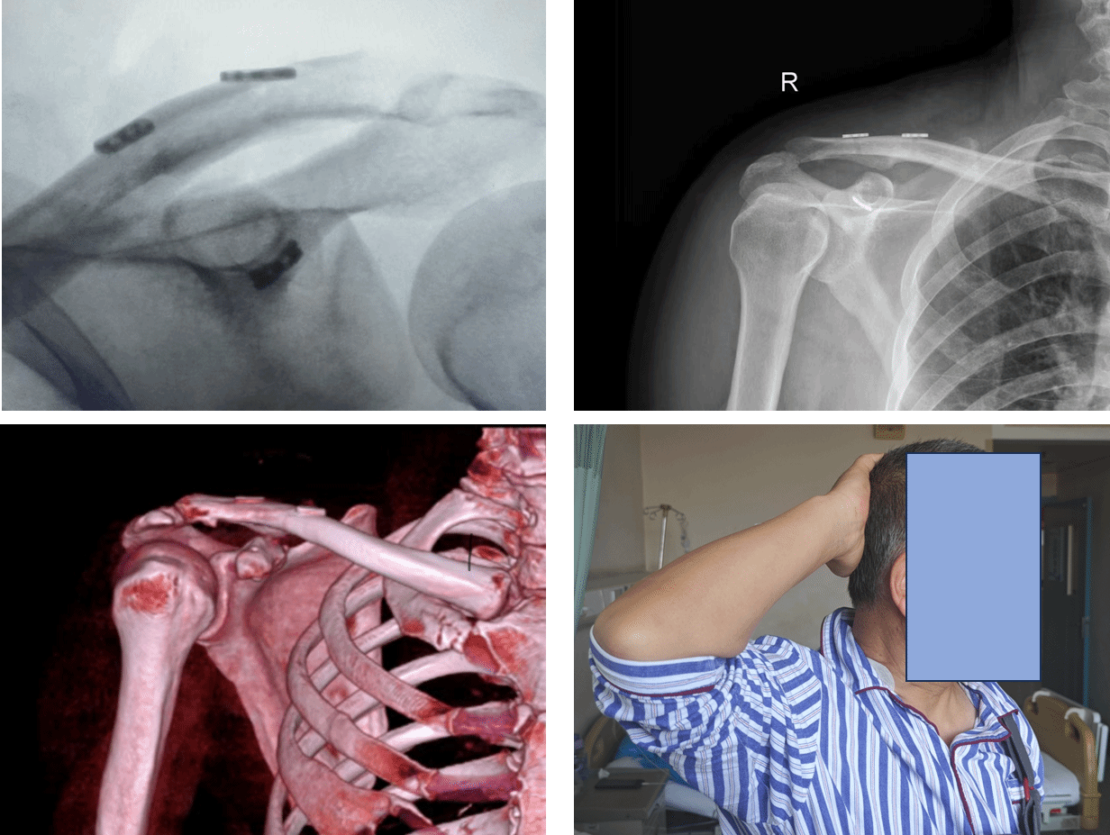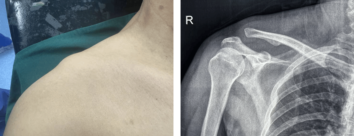 三个月前,王先生不幸发生车祸,车祸后导致其锁骨高高翘起,现今肩膀疼得无法动弹,已经影响正常生活。王某经多方打听后,就诊于西安交通大学第二附属医院骨科中心运动医学门诊,接诊医生倪建龙诊断王某属于“肩锁关节Rockwood V型脱位”的重度陈旧性损伤,X光片检查显示:右侧锁骨远端像翘起的屋檐般高高耸起,与肩胛骨分离,这是典型的高能量肩锁关节脱位。“好比连接锁骨和肩胛骨的‘天然铆钉’(喙锁韧带)完全断裂。”倪建龙副主任医师解释:“传统钩钢板好比用铁片强行压住锁骨,不仅创伤大,术后常伴随肩关节疼痛和僵硬。”