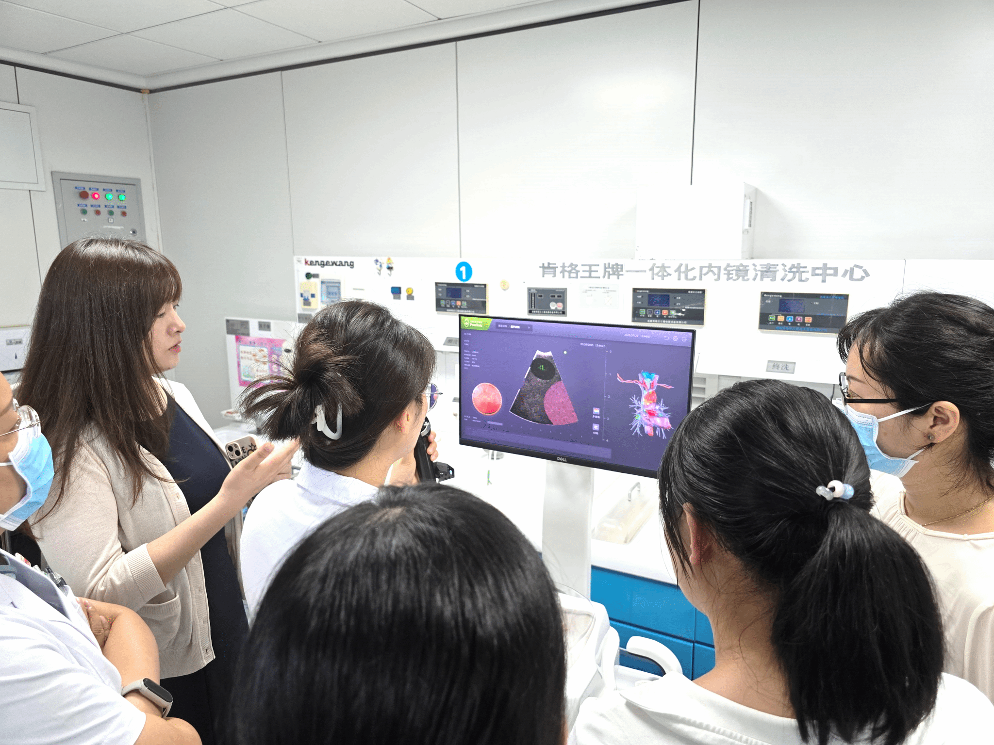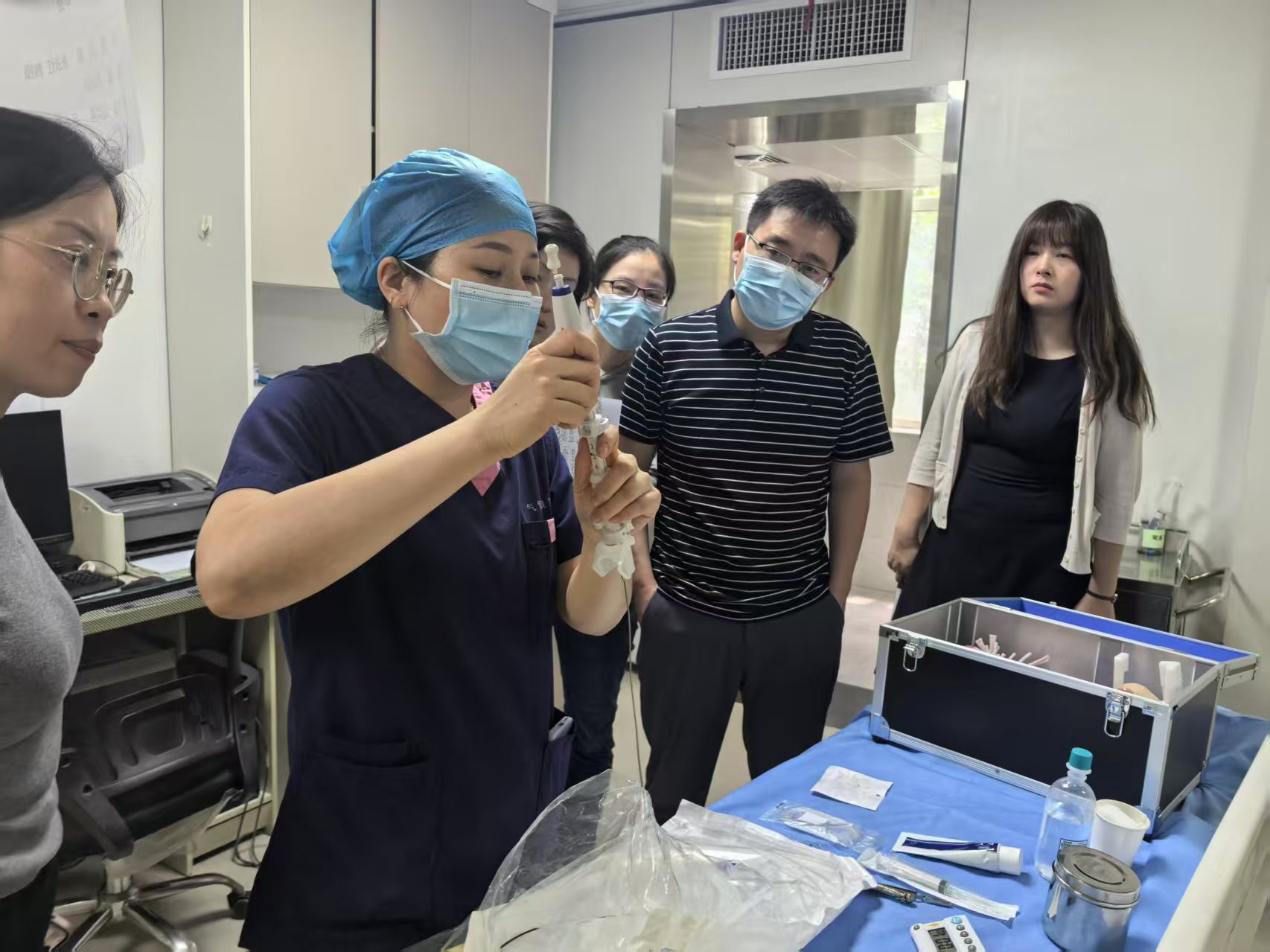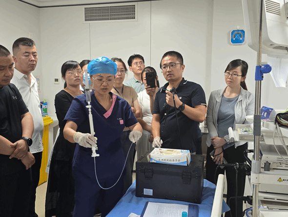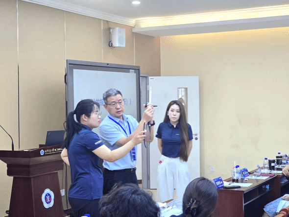 此次培训创新性设置EBUS模拟操作环节,由单虎主治医师、张永红主治医师、谢梅护士、吕洁护士分组指导学员进行EBUS-TBNA模型演练。通过超声支气管镜模拟器,学员在零风险环境下掌握淋巴结定位、穿刺深度控制等关键技术,将培训推向高潮。多位学员表示:“这种即学即练的模式极大提升了学习效率和操作信心。”