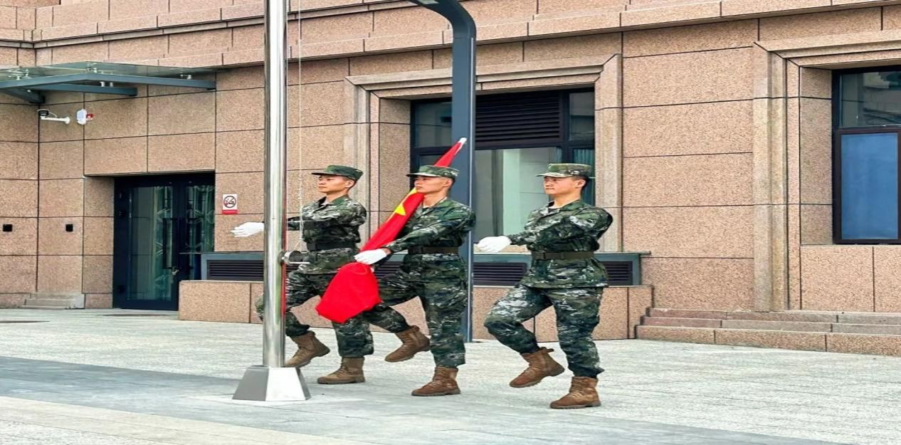 伴随着庄严的国歌声,3名护旗手护送国旗入场,鲜艳的五星红旗冉冉升起,全场庄严肃立,面向国旗行注目礼,表达对伟大祖国的深情祝福。
