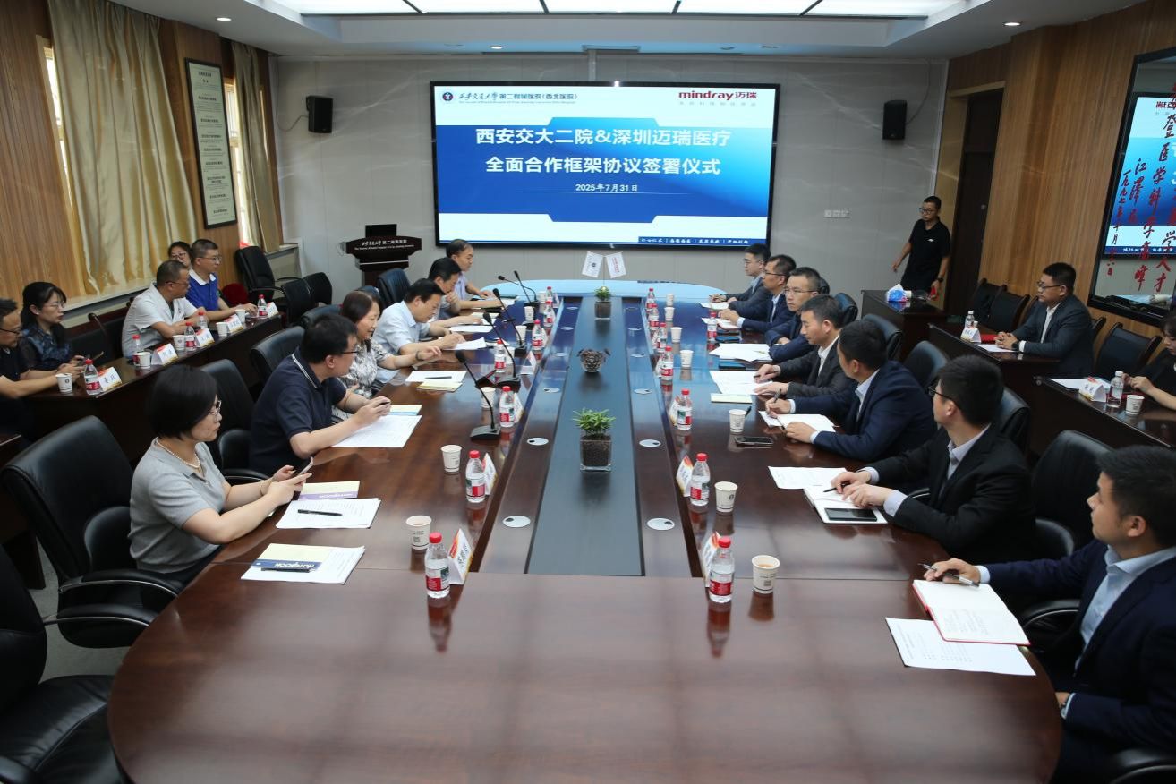 7月31日下午,西安交通大学第二附属医院与深圳迈瑞生物医疗电子股份有限公司在医院宗濂会议室举行了全面合作框架协议签署仪式。迈瑞生物高级副总裁李在文一行专程来院回访签约,医院有关领导班子成员、相关职能部门及临床科室负责人参加。本次会议由医院国有资产与医学装备管理办公室主任叶泽宇主持,院党委书记刘昌、副院长种铁、迈瑞生物高级副总裁李在文分别致辞,双方围绕合作事宜展开座谈交流,张蓬勃院长作总结讲话,随后双方签署了全面合作框架协议。