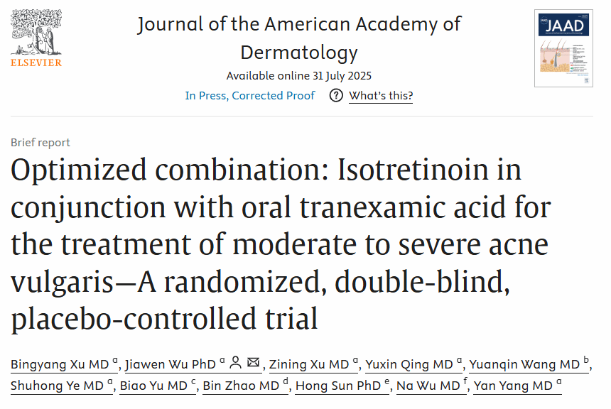 2025年7月31日,西安交通大学第二附属医院皮肤病院吴佳纹教授团队在国际顶级皮肤科期刊排名首位的《Journal of the American Academy of Dermatology》(IF=11.8)上发表了题为“Optimized combination: Isotretinoin in conjunction with oral tranexamic acid for the treatment of moderate to severe acne vulgaris-A randomized, double-blind, placebo-controlled trial”的最新研究论文,证实了异维A酸联合口服氨甲环酸治疗中重度寻常痤疮的有效性及安全性。