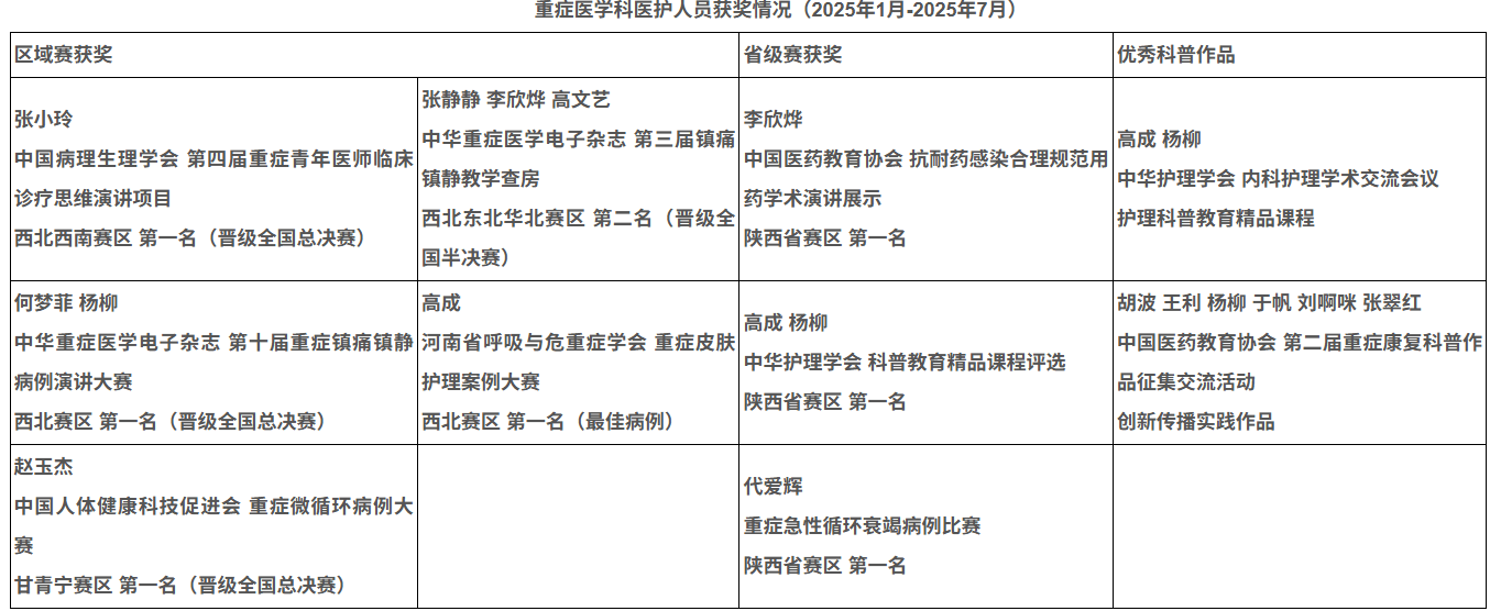2025年初至今,西安交通大学第二附属医院重症医学科医护人员在全国多项赛事中奋勇争先、佳绩连连,斩获多项国家级奖项,其中3组选手成功入围全国总决赛。这些成绩不仅是对参赛者个人能力的高度认可,更展现了科室在专业素养、临床技能、质量管理和人文关怀等方面的卓越实力,同时也为医院高质量发展提供了强劲助力。