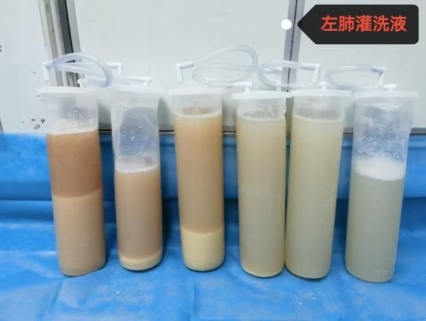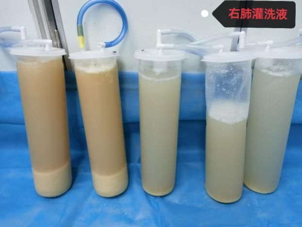 方萍主任医师团队与患者家属进行充分沟通并取得支持后,一场多学科协作的生命保卫战打响。首先,麻醉科雷晓鸣主任医师和宋正川副主任医师团队为患者实施全麻下双腔气管插管有创呼吸支持,随后呼吸与危重症医学科和急诊科ECMO团队(呼吸与危重症医学科方萍主任医师、邓文静主治医师、樊娜主治医师、刘勇护士、韩青青护士以及急诊科冯辉主治医师等)立即为患者建立VV-ECMO通路并顺利转机,患者氧合情况迅速稳定。随后,手术台上,方萍主任医师、黎蒙护士以及手术室多名医护人员紧密配合,共使用20000毫升37℃生理盐水为患者进行双肺“深度清洁”。灌洗回收液从最初的浑浊“牛奶状”逐渐变得清澈,回收率>90%,快速直观地展现了灌洗的效果。