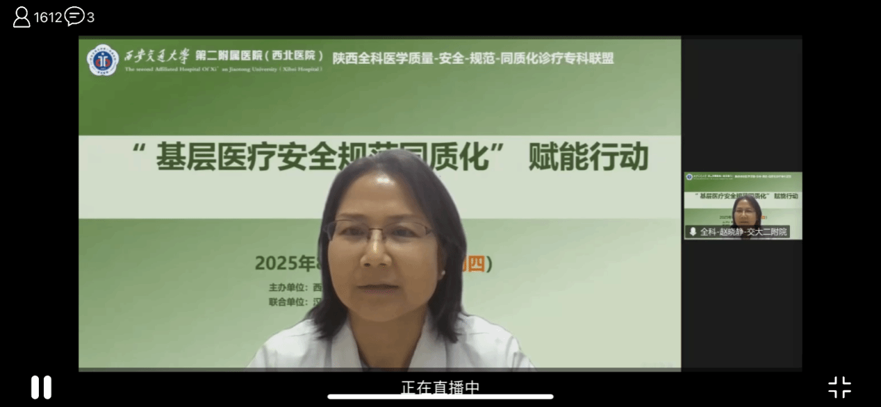 2025年8月28日,由西安交通大学第二附属医院牵头,汉中市中心医院、汉台区石马中心卫生院、陕西省保健学会全科医学专业委员会、西安医学会全科医学分会联合举办的“基层医疗安全规范同质化”赋能行动第4期,以“线上直播+互动研讨”的形式,在三秦大地的云端准时开播。来自联盟各成员单位的基层全科医师、全科骨干与管理者共1612余人共同参与了一场高质量的学术盛宴。