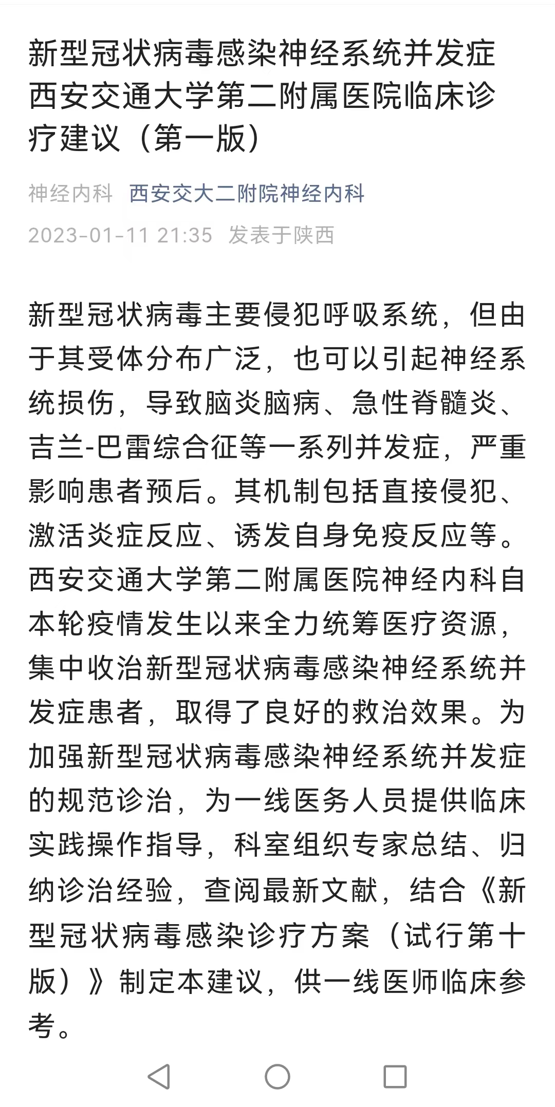 新型冠状病毒感染者可于发病早中期发生神经系统损害,其临床表现多样、形式及种类繁多、治疗相对复杂,可能影响患者预后。神经系统损害一旦发生,应早期识别、及时评估和针对性、个体化治疗。西安交通大学第二附属医院充分发挥团队力量,敢于迎难而上,勇于突破瓶颈,省内率先启动新型冠状病毒感染神经系统损伤救治绿色通道,神经内科成功救治数十例新型冠状病毒感染神经系统损伤危重患者,让近百位新冠感染患者成功回归正常家庭生活。同时为提高一线医务人员实践操作能力,更好服务患者,西安交大二附院组织院内专家总结、归纳诊治经验,结合《新型冠状病毒感染诊疗方案(试行第十版)》和最新文献,紧急编写并发布了“西安交通大学第二附属医院新型冠状病毒感染神经系统并发症临床诊疗建议”,获得广泛好评。