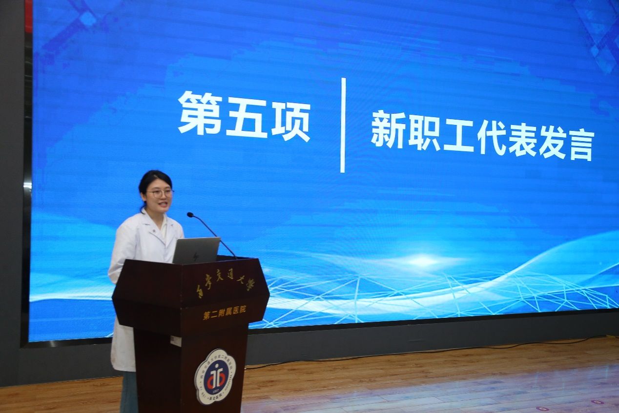新职工代表于雨璇在发言中表达了随着从医学院到临床一线自身身份的转变,一份新的使命由此开始,要始终把医疗质量与患者安全放在首位。依托二附院平台,她将积极参与学科建设和科研课题,努力成长为兼具临床能力与科研创新力的青年医务工作者。