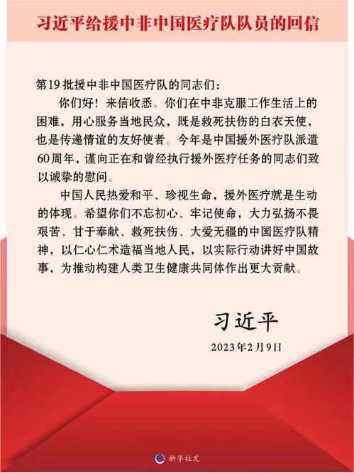 国之交在于民相亲,民相亲在于心相通。半个世纪以来,中国援苏丹医疗队,无论战争、疾病、疫情、政治动荡,从未间断过医疗援助,展现了“不畏艰苦、甘于奉献、救死扶伤、大爱无疆”的医疗队精神,也和当地百姓结下了深厚的友谊。一代代医疗队全力以赴、克服重重困难,为推动构建人类卫生健康共同体做出巨大贡献。在习总书记的勉励下,西安交通大学第二附属医院的援外医疗队员也必将不忘初心、薪火相传,以仁心仁术造福当地百姓,以实际行动讲好中国故事,为中非友谊添砖加瓦。