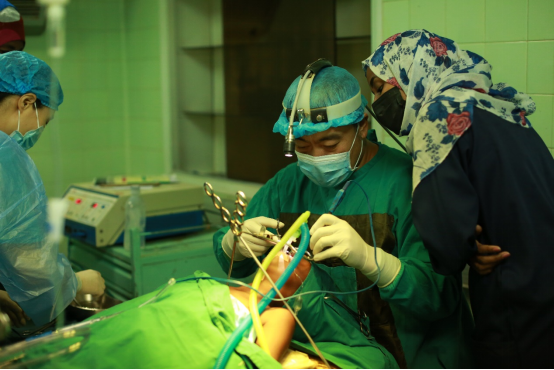 苏丹地处撒哈拉沙漠附近,是传染病高发的国家,而医疗队所处的地方经济条件差、医疗资源匮乏、医疗设备欠缺,我们克服重重困难,在医院逐渐打开局面,众多患者慕名而来。听说杜可图了C尼(中国医生)在门诊坐诊,一岁的哈萨丽被父母抱进了神经外科诊室。巨大的头围导致前后囟门仍未闭合,从CT可看到巨大的脑室系统影响到了正常脑结构的发育,经过详细询问病史,最终确诊为先天性脑积水,需要进行脑室腹腔分流手术。虽然小孩父母信仰伊斯兰教,却没有对手术有质疑或恐惧,对我们中国医生特别信任。经过充分地术前预案和准备,并与当地医生默契配合,一个小时左右即完成脑室腹腔分流手术。手术结束后,恩图曼医院的医生、麻醉师和护士都竖起大拇指,说道:过意思,过意思吉登!(好,非常棒!)把患儿推出手术室时,小孩父亲笑着合手向我们致意感谢。因经济、认识等问题所限,并非所有的患者都能及时得到诊治。而我们来到苏丹的使命便是尽自己所能帮助当地患者解除病痛,授人以鱼不如授人以渔,将神经外科常见疾病的诊疗技术传授给当地医生,进行多发病的科普教育,力求改变当地医生及患者对某些疾病认识存在的问题,纠正当地医生手术、麻醉中的错误操作,示范讲解规范手术操作,改变当地人对疾病的传统观念。虽然医疗队的工作充满挑战,但习总书记对援非医疗队的嘱托,不畏艰苦、甘于奉献、救死扶伤、大爱无疆的中国医疗队精神及西安交通大学第二附属医院的光荣传统,一直鞭策着我赓续前行!我将继续以高尚的医德和精湛的医术为苏丹人民服务,展现中国医务工作者的风采,为增进中苏人民友谊、构建人类卫生健康共同体作出贡献!