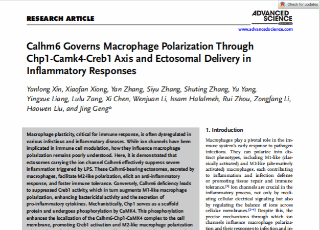近日,我院生物诊断治疗国家地方联合工程研究中心、西安市细胞应激与疾病诊疗国际合作基地、西安交通大学精准医学研究院、生命科学与技术学院等合作研究,在国际高水平期刊《Advanced Science》在线发表题为《Calhm6通过Chp1-Camk4-Creb1轴及核外颗粒递送途径调控巨噬细胞极化并参与炎症反应》(“Calhm6 governs macrophage polarization through Chp1-Camk4-Creb1 axis and ectosomal delivery in inflammatory responses” )(IF:14.1, Q1)的合作研究成果,揭示了钙离子通道Calhm6通过核外颗粒调控巨噬细胞参与的急性炎症和组织修复中的保护作用。
