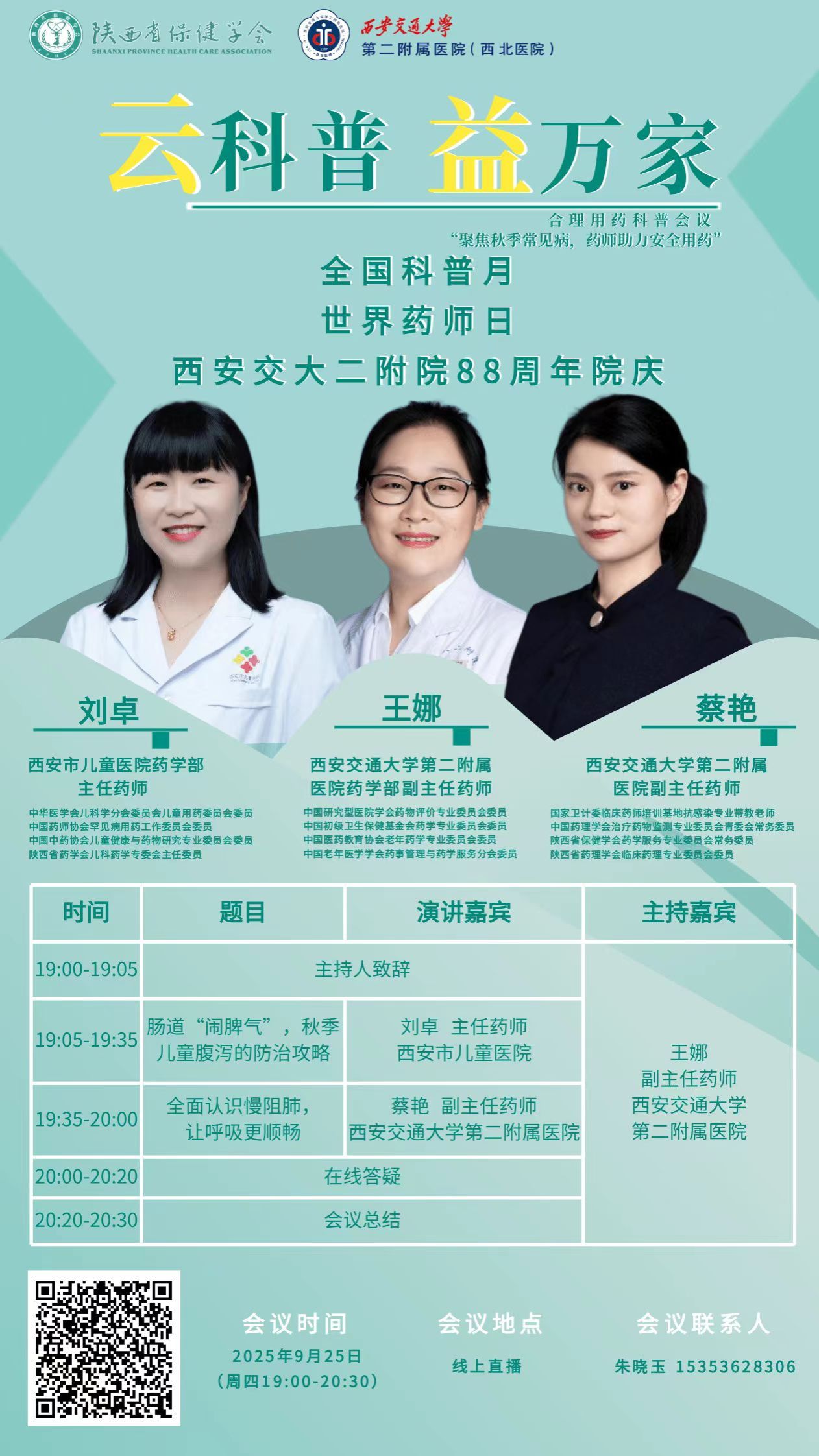 药学部推出 “云科普 益万家” 合理用药科普直播讲座,聚焦秋季常见病,邀请西安市儿童医院药学部刘卓主任药师、药学部王娜副主任药师、蔡艳副主任药师等专家,围绕 “肠道‘闹脾气’,秋季儿童腹泻的防治攻略”“全面认识慢阻肺,让呼吸更顺畅” 等主题开展线上直播讲座。直播过程中,药师们用通俗易懂的语言讲解专业药学知识,并实时解答观众用药疑惑。此次直播吸引2000余人次观看,让大众足不出户就能获取用药指导。