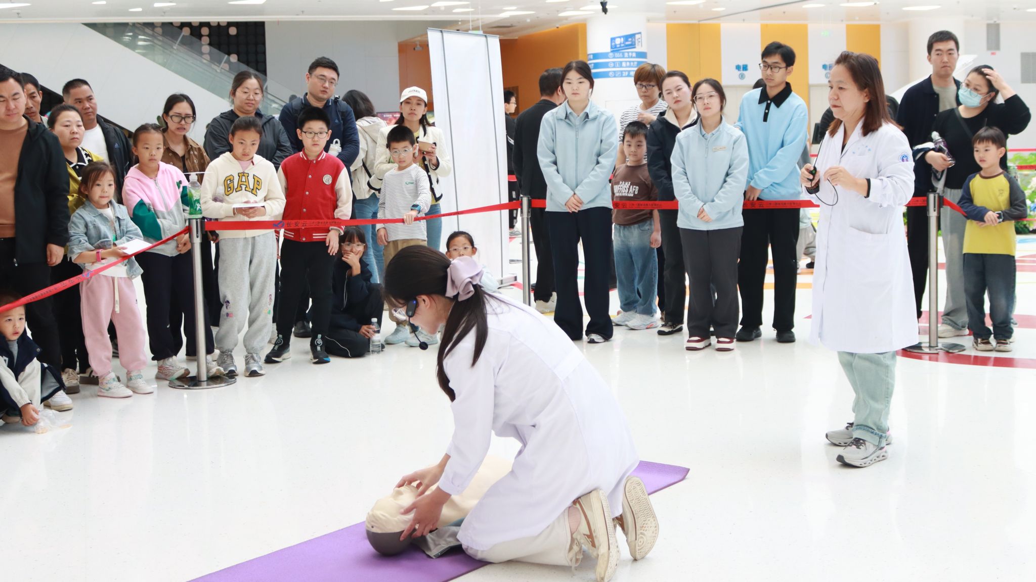 朱丹主管护师针对成人、孕妇、肥胖人群、自救以及婴幼儿童常见的呼吸道异物梗阻风险,分别演示了不同的海姆立克急救手法。朗朗上口的“剪刀、石头、布”口诀让孩子们迅速掌握了要领。互动环节里,孩子们两两一组,互相练习这“生命的拥抱”,欢快的笑声充满了整个大堂。家长们纷纷鼓掌,表示这项技能对于防范孩子吃饭噎住等家庭意外急救时意义重大。