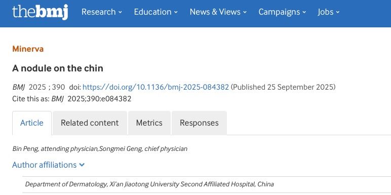 皮肤病院耿松梅教授团队撰写的病例报道《A nodule on the chin》(中文译名:下颌结节一例)于2025年9月25日在国际顶级医学期刊《The BMJ》正式发表。本文第一作者为彭斌主治医师。该病例生动体现了皮肤科作为“窗口”学科在揭示潜在疾病中的关键价值。