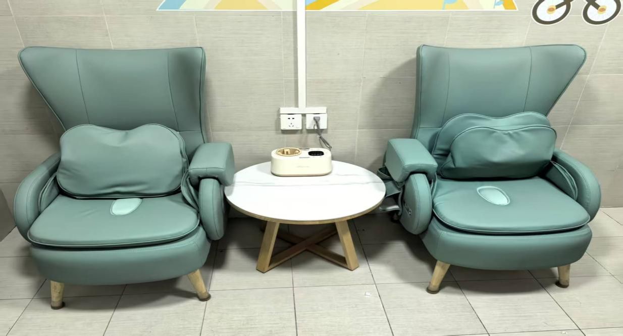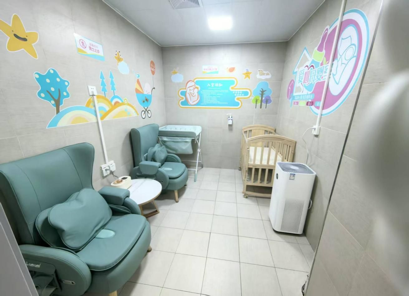 室内配备了舒适的哺乳沙发,柔软的材质、贴合人体工学的设计,为哺乳妈妈提供了惬意的休憩空间;新增的小熊温奶器,可精准控温,方便妈妈为宝宝加热辅食或母乳;还设置了实木婴儿床,让宝宝能在舒适的环境中安然入睡。同时,母婴室配备了空气净化器,实时监测并净化室内空气,为母婴营造了洁净清新的环境。墙面的童趣装饰画,可缓解婴孩的紧张情绪。