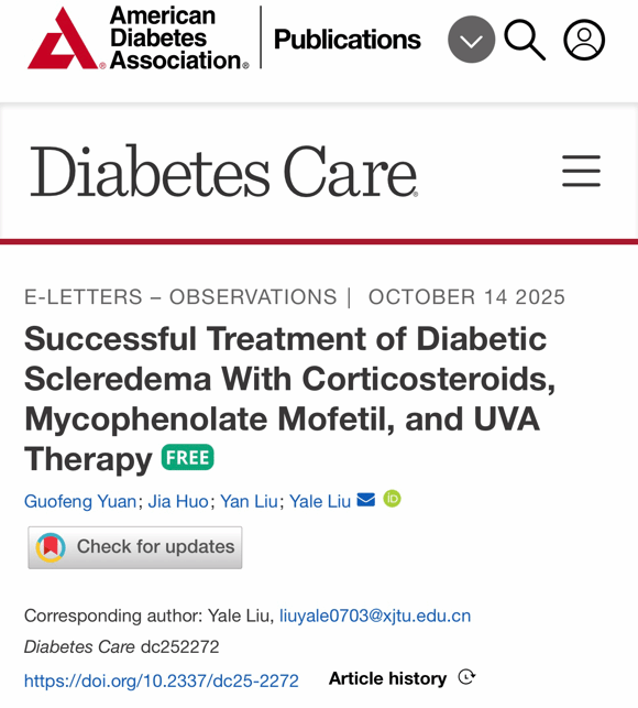 近日,刘亚乐副研究员在病房管理患者中,治疗了一例一直以来被误诊为颈椎病的糖尿病硬肿症患者,通过联合使用皮质类固醇、霉酚酸酯和UVA光疗,取得显著疗效的案例,为这一罕见且难治的糖尿病皮肤并发症提供了新的治疗思路。该案例发表于美国糖尿病协会会刊《Diabetes Care》上。
