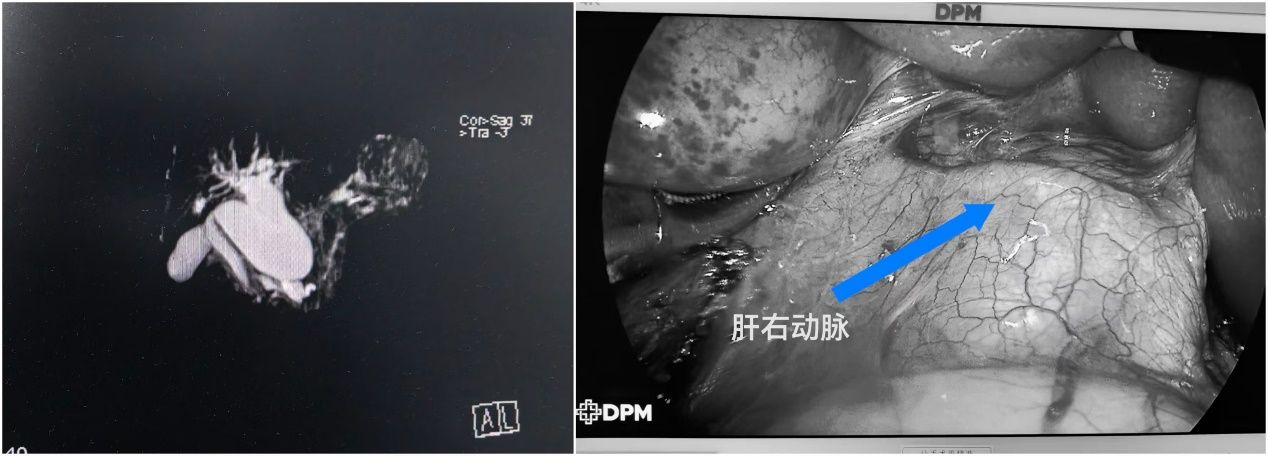 左图示胆总管囊肿MRCP表现,右图示肝右动脉骑跨在肝总管上