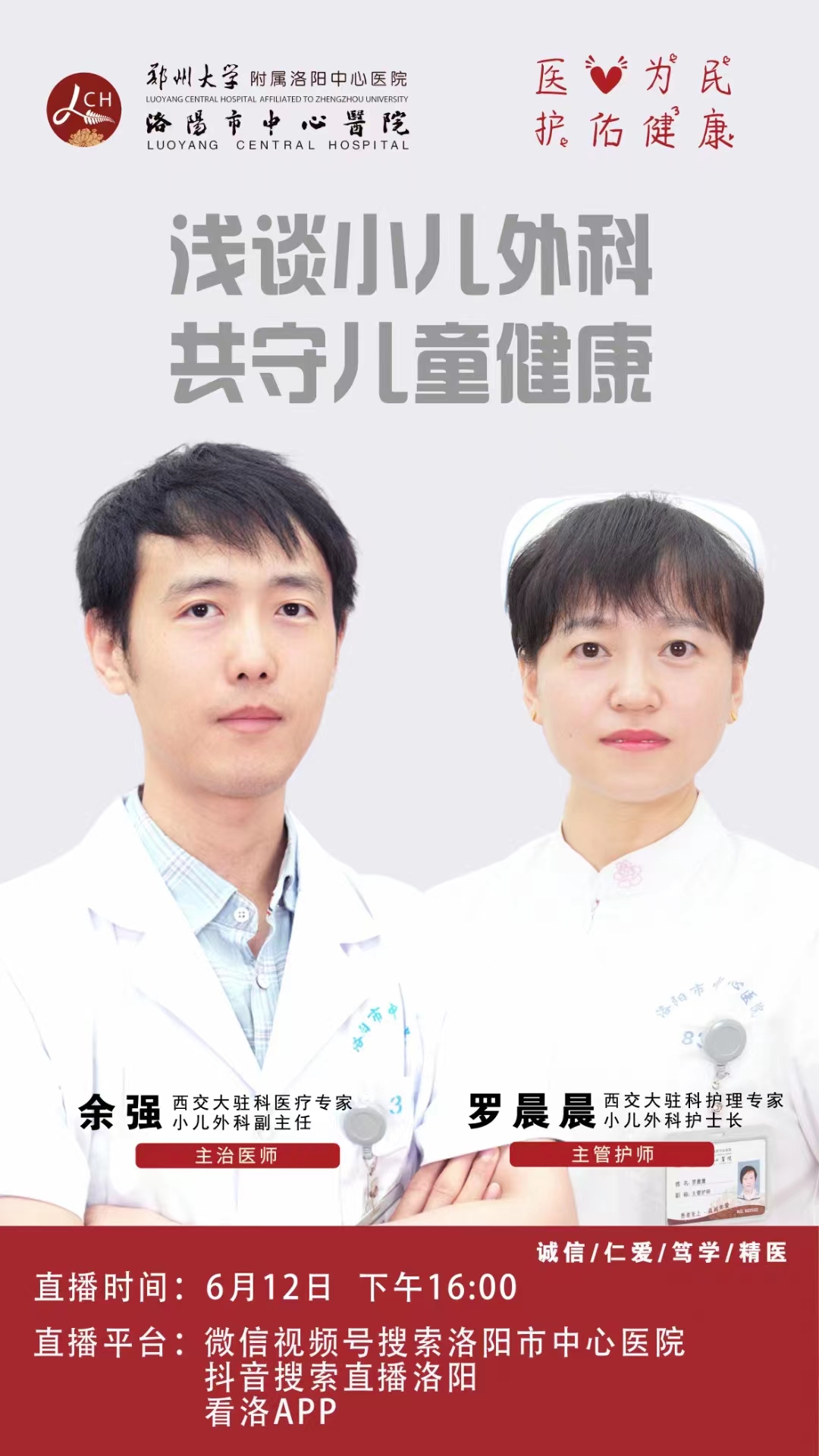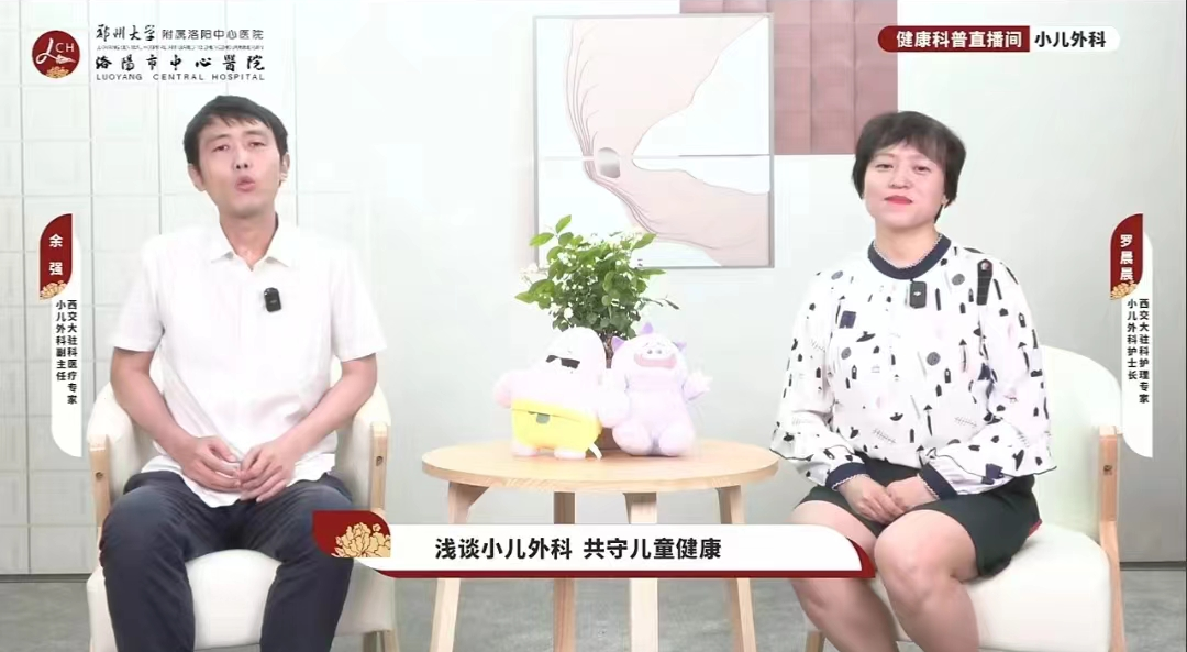 洛阳市中心医院小儿外科是国家区域医疗中心平移科室,依托国家重点专科—西安交通大学第二附属医院小儿外科,由中华小儿外科学会普胸外科学组副组长、西交大二附院小儿外科主任李鹏教授担任科室主任。西安交通大学第二附属医院长期驻派医疗护理专家团队驻洛,真正做到人才、技术、教研的平移,高起点、高质量、高水平快速发展,实现国内最领先的诊治技术下沉,尤其是先天性肺疾病、先天性胆总管囊肿、先天性巨结肠、小儿肿瘤等疾病的微创技术。为了让老百姓在“家门口”就能看好病,享受到优质的医疗资源,洛阳市中心医院健康科普直播间做了大量宣传,6月19日下午16:00驻洛工作人员余强医生、罗晨晨护士应邀来到直播间,经过精心的准备,以及专业的医学知识和丰富的临床经验,进行了题为【小儿外科——浅谈小儿外科 共守儿童健康】的直播。不止于“声”,用直播传递专业。