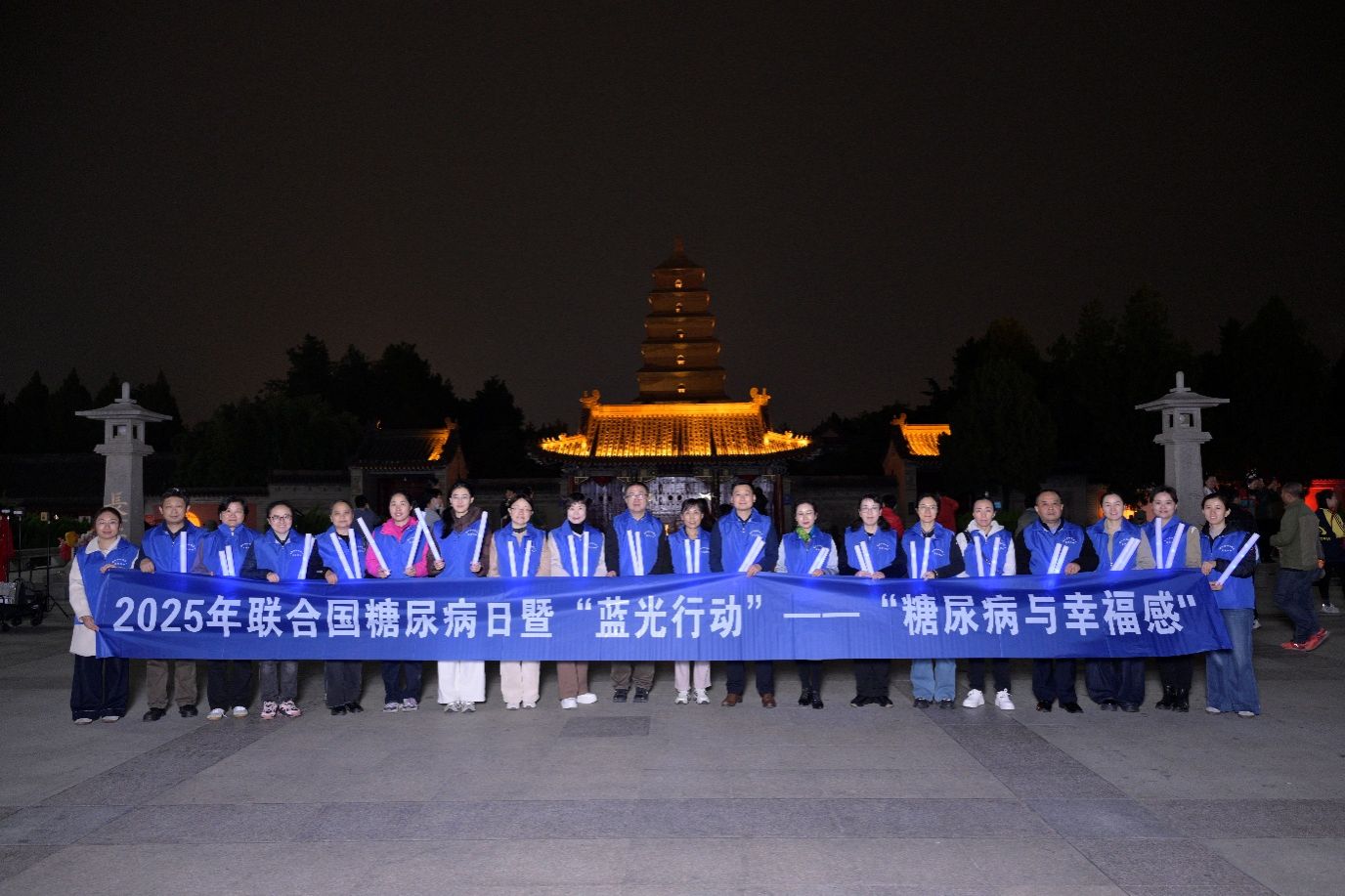 夜幕降临,威严壮阔的大雁塔被蓝光照耀,将糖尿病防治公益活动与古老的历史文化相结合,为历史文化遗迹注入新的活力和意义,让参与活动的人们感受到历史文化底蕴的同时,深刻地认识到糖尿病防治的重要性。耀目蓝光映千年古塔,盛唐文脉启健康新程。未来,我们将以持续行动深化糖尿病防治科普与服务,踔厉奋发、笃行不怠,为筑牢市民健康防线、守护群众幸福生活坚实前行,奋力书写陕西糖尿病防治工作的新篇章!
