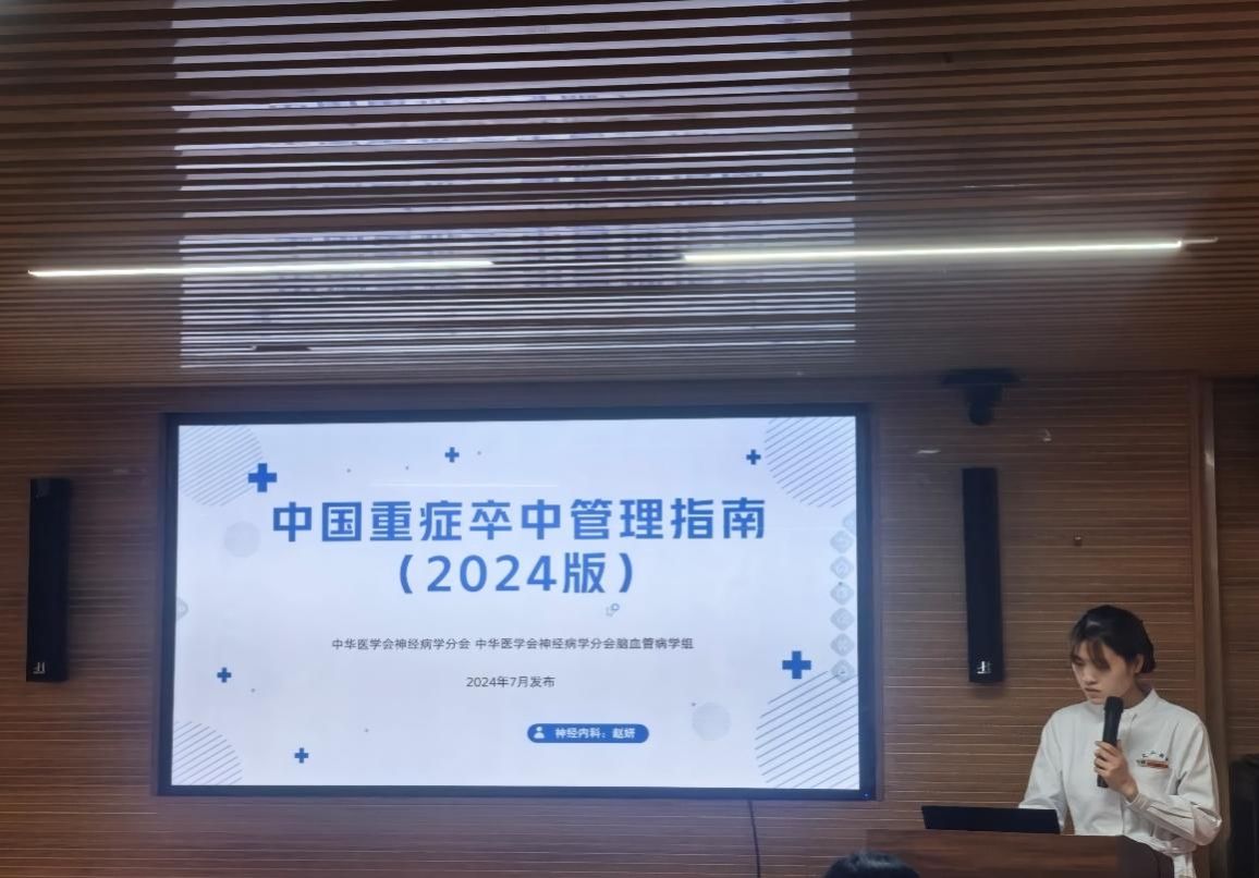 活动的下半场,视角转向神经系统急重症领域。神经内科赵妍老师为培训带来了《中国重症卒中管理指南(2024版)》的详细解读。讲解深入浅出,紧扣临床实际,重点围绕血压的精细化管理、体温控制、常见并发症的预防与处理以及早期康复介入等核心议题,对新版指南的更新要点与推荐意见进行了详尽阐述。她的解读不仅及时更新了护理团队的知识库,更为重症卒中患者的规范化、同质化护理提供了科学可靠的行动指南,标志着我院神经专科护理水平正与国家级前沿标准同步接轨。