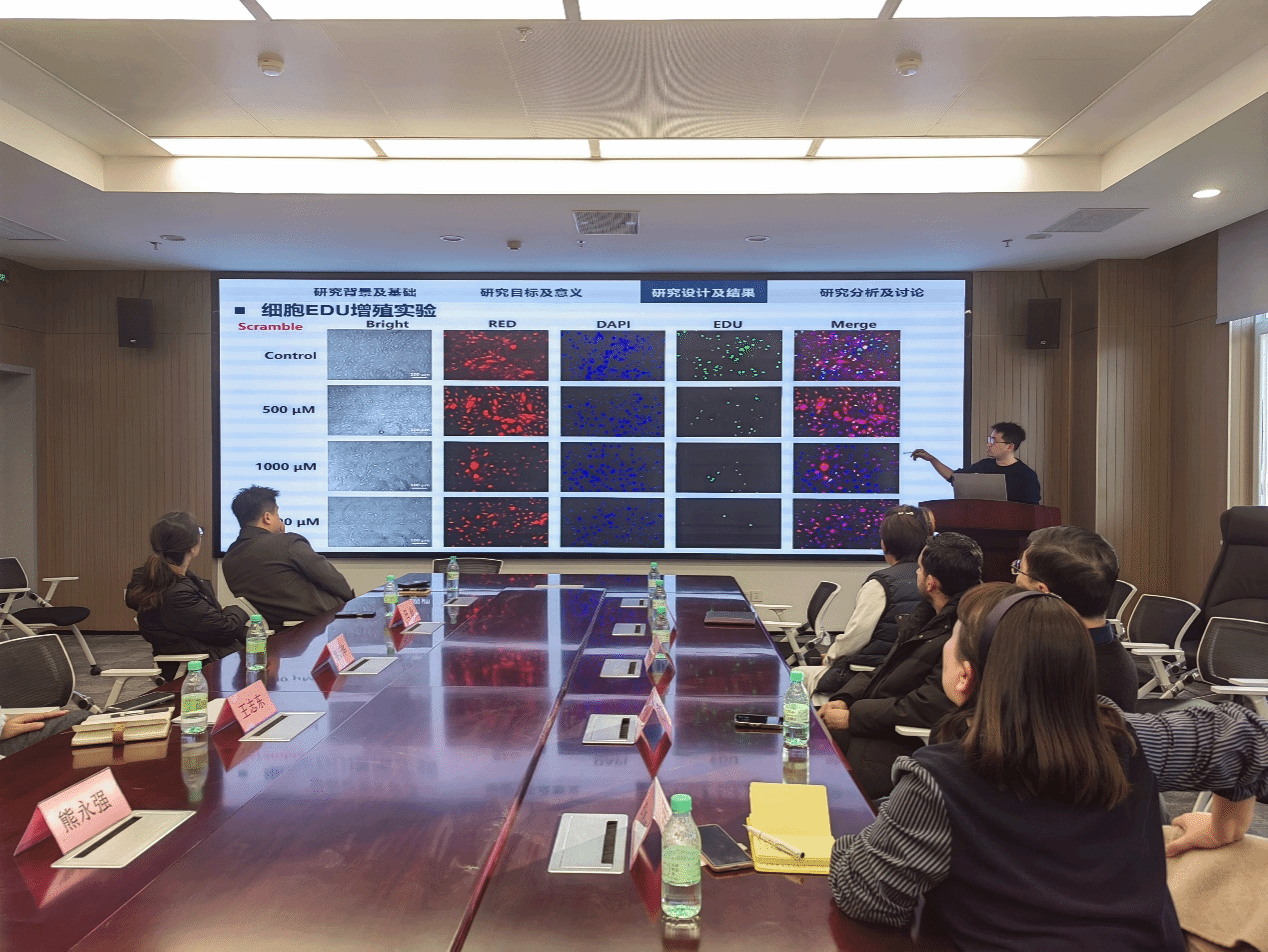 交流环节,与会人员围绕甲状腺癌机制研究、分子靶标选择及临床转化路径等展开热烈讨论。王志东主任高度评价侯鹏教授报告的前瞻性与指导意义,认为其围绕甲状腺癌发生发展机制提出的精准靶向治疗思路具有重要借鉴价值,并结合科室临床实践,肯定相关分子靶标的转化潜力,期待双方在药物研发及临床验证等方面开展合作,积极推动转化落地。科室博士研究生苏元浩进行甲状腺癌的课题汇报,并现场请教侯教授自己课题研究中的困惑和难点,姬媛媛教授亦聚焦团队研究现状与侯教授展开交流讨论。侯教授对现场提问逐一作出细致解答,令大家受益匪浅,现场学术氛围浓厚。