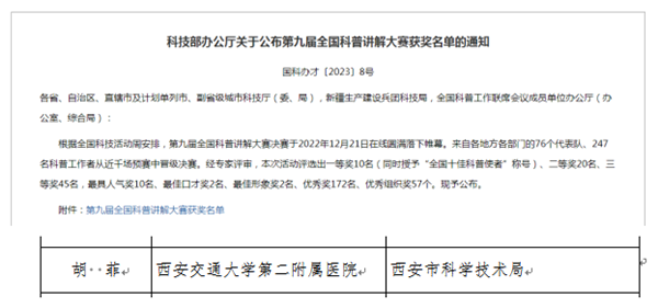 近日,第九届全国科普讲解大赛在广东科学中心落下帷幕,来自全国76支代表队的249名选手通过网络视频连线的方式竟逐“云端”。经过激烈角逐、大浪淘沙,我院急诊科胡菲以急救技能—“海姆立克急救法”脱颖而出,荣获全国优秀奖。此次获得的国家级荣誉,是参加科普讲解大赛以来的最好成绩。