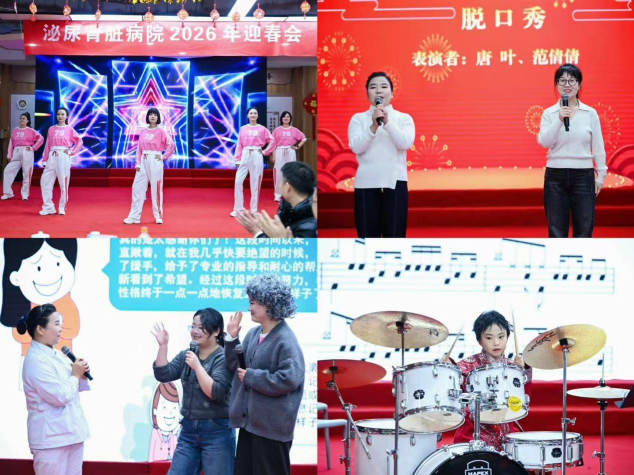 此外,情景剧《激素风暴下紫纹的声音》聚焦临床护理场景,展现了护理团队的专业与担当;架子鼓、独舞、独唱等节目轮番登场,尽显泌尿肾脏病院职工及医二代的多才多艺;群口相声《“透”亮人生》以透析治疗为切入点,用诙谐的语言科普医学知识,兼具趣味性与专业性。三轮游戏抽奖环节更是将晚会推向高潮,欢呼声、掌声此起彼伏。最后,全体领导及骨干共同唱响《保卫黄河》《团结就是力量》等经典曲目,铿锵有力的歌声凝聚起全院上下同心、砥砺前行的坚定信念。
