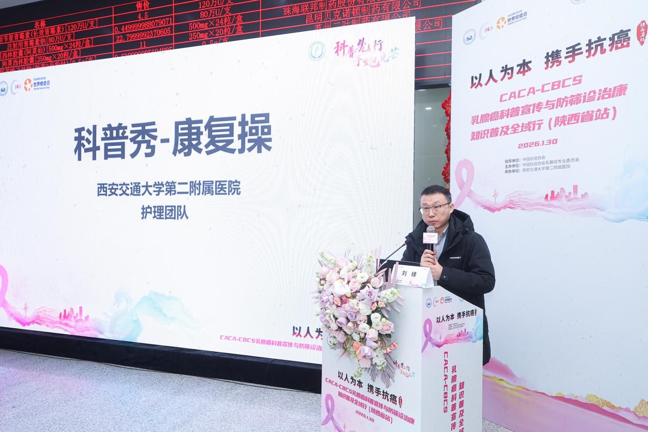 2026年1月30日上午,由中国抗癌协会、中国抗癌协会乳腺癌专业委员会(CACA-CBCS)主办的、西安交通大学第二附属医院承办的“循象问道 和合共生 ——2025CACA 乳腺癌科普全域行(西安站)暨 CACA-CBCS 乳腺癌科普宣传与防筛诊治康知识普及全域行”活动在西安成功举行。本次活动旨在提升公众对乳腺癌防治知识的认知,加强医患沟通,推动乳腺癌早筛、早诊、早治理念的普及,为女性构筑起一道坚实的健康防线。活动在西安交通大学第二附属医院大明宫院区举行,吸引了众多医护人员、患者及家属参与。