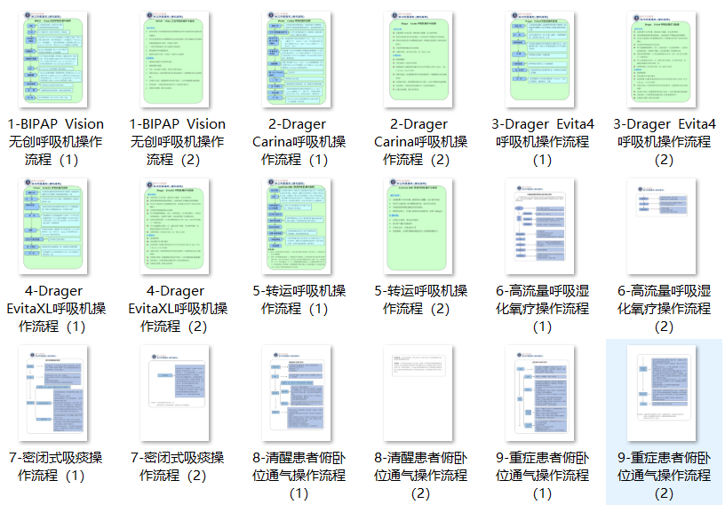 此次操作流程的制定与修订由护理部组织,呼吸与危重症医学科、急诊科等多学科通力合作,主要内容包含我院所有型号有/无创呼吸机、转运呼吸机操作流程、高流量呼吸湿化仪、密闭式吸痰操作流程、清醒/重症患者俯卧位通气操作流程。