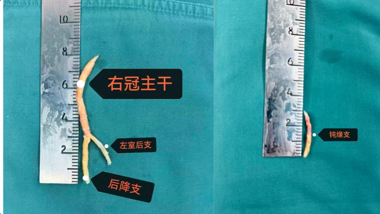 在充分而细致的术前准备后,手术由高峰教授主刀进行。术中发现患者右冠脉及钝缘支广泛钙化,切开血管后见管腔长段闭塞,内膜严重粥样硬化,无法行桥血管吻合。高峰教授沉着应对,长段切开右冠脉及后降支,仔细剥脱出长约8cm的Y型粥样硬化内膜,继而如法炮制,于钝缘支剥脱出长约3cm粥样硬化内膜;随后完成左乳内动脉-前降支、桡动脉-钝缘支、大隐静脉-后降支血管吻合;针对二尖瓣重度反流,同期行二尖瓣生物瓣膜置换术。在麻醉科及手术室、超声科等兄弟科室的通力配合下手术顺利完成。