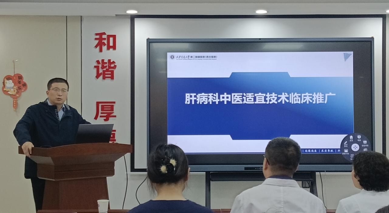 宣讲会由肝病科纪泛扑主任主持,中医科郭昶医师、薛渊医师担任主讲,吴仲恒副主任代表中医科发言,杨海侠护士长进行护理操作指导。肝病科全体医护骨干积极参与,现场交流热烈。