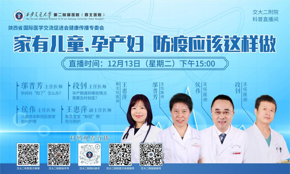12月13日,西安交通大学第二附属医院联合陕西国际医学交流促进会健康传播专委会在线上开展了“家有儿童、孕产妇 防疫应该这样做”直播活动,邀请妇产科邬晋芳主任医师、段钊主任医师、小儿内科侯伟主任医师、新生儿病区王慧萍副主任医师做客直播间,在直播间详细讲述了孕产妇及儿童居家相关问题,指导孕妇和婴幼儿等重点人群如何做好防护及自我疏导,解答了观众的相关问题,缓解了大家的担忧情绪。二附院官方视频号、抖音号、快手号、微博号及华商网、“陕西健康”微博同步直播,累计观看量达17.8万人次。