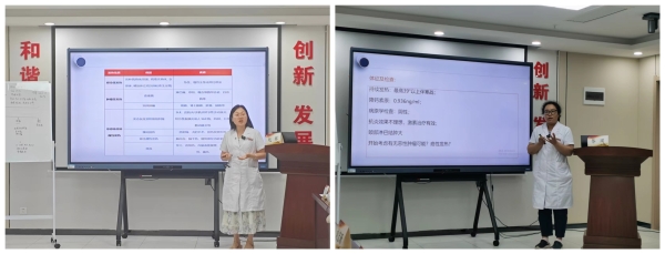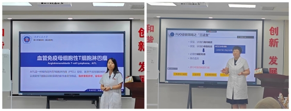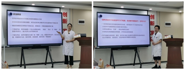此外,活动还邀请了肿瘤内科昝瑛副教授,血液内科王瑾副教授,核医学科屈伟副教授、风湿免疫科赵辉主治医师作为MDT讨论嘉宾。屈伟老师围绕PET-CT在发热待查患者中的应用,为学员们详细梳理了PET-CT如何帮助医生精准定位病灶,鉴别感染、炎症与肿瘤等复杂情况;赵辉老师从不同风湿免疫病的共性与特性入手,带学员们逐一分析患者可能的诊断及后续需要的检查;昝瑛老师详细介绍了肿瘤引起发热的多种机制,以及如何通过临床表现、实验室检查、影像学检查及活体组织检查等手段进行综合判断;王瑾老师从专业角度分享了血管免疫母细胞型T细胞淋巴瘤的临床表现,诊断依据,治疗方案和专业的指导意见。他们抽丝剥茧层层递进的引导住培医师们深入掌握发热待查的病理生理机制及诊治原则。线上线下的住培医师们纷纷表示,通过此次学习,他们对发热待查患者的诊疗策略有了更加全面和深入的理解,将努力将所学知识应用于临床实践中,为患者提供更加精准、有效的医疗服务。