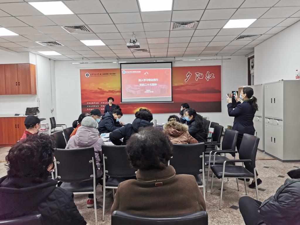 院党委副书记党变玲从党的二十大基本情况、党的二十大报告架构、深刻领会党的二十大主题、深刻领会“两个确立”的决定性意义、志气骨气蓄底气自信自强传精神等五方面进行阐述。在讲到对党的二十大精神学习的重点时,用五个“牢牢把握”、九个“深刻领会”进行了具体讲述。讲到“党的二十大报告架构”从十五点进行了详细讲述,在深刻领会党的二十大主题中,她讲到:“党的二十大主题是大会的灵魂,是党和国家事业发展的总纲,是学习宣传贯彻党的二十大精神必须深刻领会的重要内容。党的二十大的主题,鲜明昭示了我们党在新征程上举什么旗、走什么路、以什么样的精神状态、朝着什么样的目标继续前进的,团结和激励全党全军全国各族人民为夺取中国特色社会主义新胜利。”讲到深刻领会“两个确立”的决定性意义时,她说到:“十九大以来的五年,是极不寻常、极不平凡的五年。新时代10年的伟大变革,在党史、新中国史、改革开放史、社会主义发展史、中华民族发展史上具有里程碑意义。新时代10年的伟大变革,是在以习近平同志为核心的党中央坚强领导下、在习近平新时代中国特色社会主义思想指引下,全党全国各族人民团结奋斗取得的。党确立习近平同志党中央的核心、全党的核心地位,确立习近平新时代中国特色社会主义思想的指导地位,反映了全党全军全国各族人民共同心愿,对新时代党和国家事业发展、对推进中华民族伟大复兴历史进程具有决定性意义。”在讲到“志气骨气蓄底气,自信自强传精神”时,她说到:“增强全党全国各族人民的志气、骨气、底气,不信邪、不怕鬼、不怕压,知难而进、迎难而上,统筹发展和安全,全力战胜前进道路上各种困难和挑战,依靠顽强斗争打开事业发展新天地。”最后,党变玲副书记针对我院离退休工作特点和实际情况,她要求全体党员和干部:“不忘初心,讲好奋斗故事,赓续党的优良传统;不弃使命,讲好发展故事,切实增强四个自信;言传身教,助力社会和谐,维护党的团结统一;学思践悟,关心医院发展,弘扬良好院风家风。”与会老师听讲非常认真,深刻领会二十大精神的思想内涵,内化于心,外化于行,在工作中认真贯彻落实二十大精神。