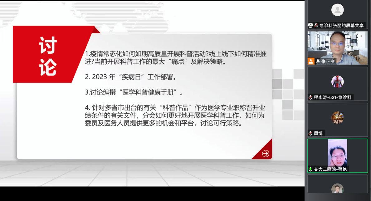 激情洋溢的讨论环节将活动推向了高潮,最后张正良主任委员对各位委员提出的建议进行了总结和梳理,并对各位专家为分会的辛勤付出表示感谢,希望在2023年继续用百姓喜闻乐见的形式来普及医学专业知识,在常态化防控形势下,发挥专业领域优势,为基层单位及三秦百姓服务,为医学科普事业贡献自己的一份力量。