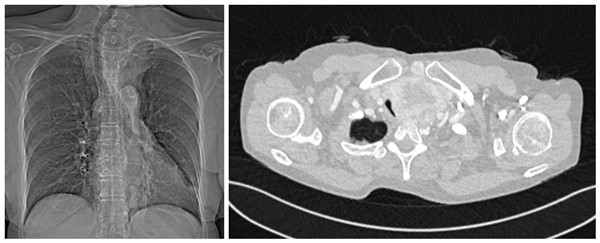 术前胸部CT:颈部及前纵隔肿块巨大,压迫导致气管狭窄并右偏明显