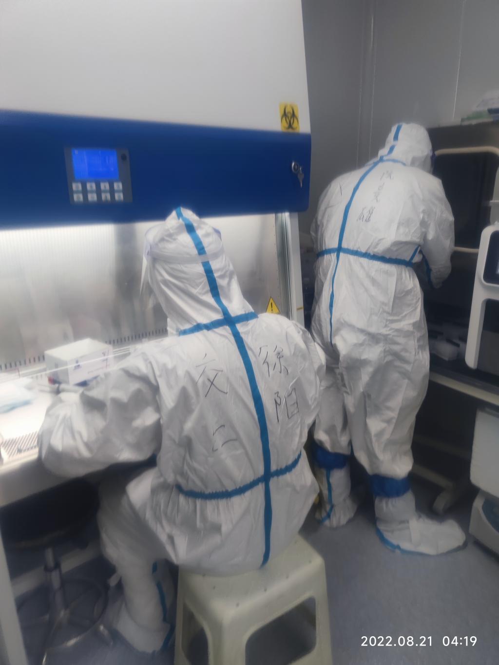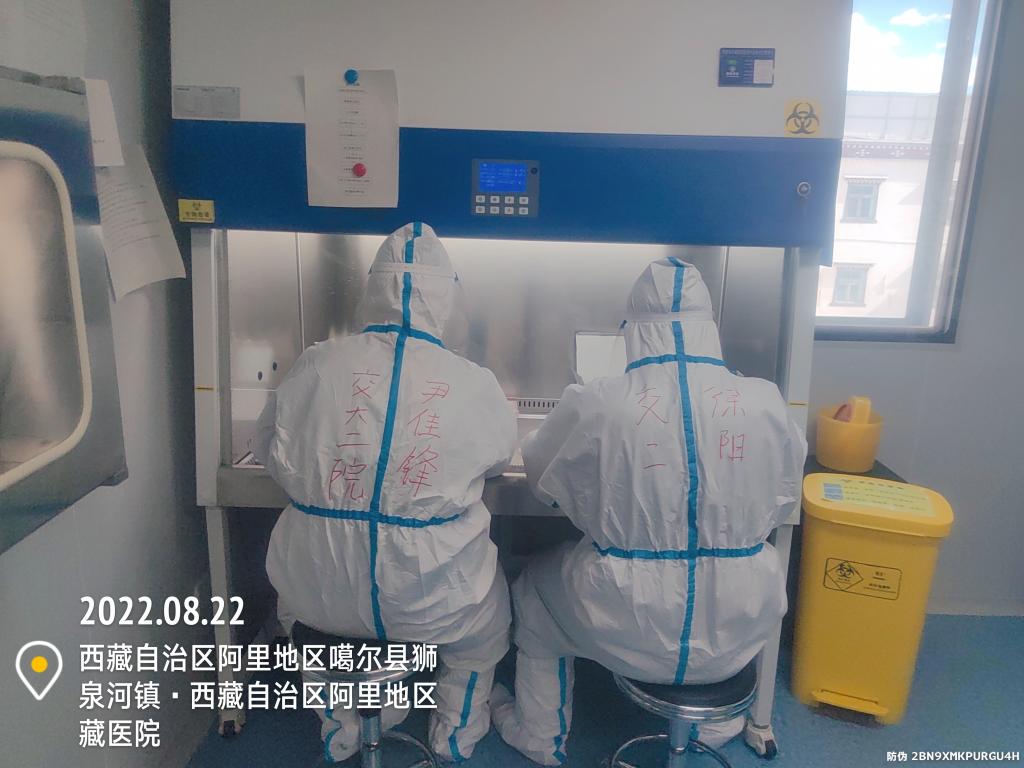 检验是离病毒最近的人,尹佳锋、徐阳医师不顾危险,坚持奋战在抗击病毒的一线,穿着厚厚的防护服工作,吃住在医院,汗水湿透了他们的衣衫、头发,模糊了他们的双眼,他们未言一句辛苦,先后在阿里地区人民医院、阿里地区藏医院支援核酸检测工作。优化当地检验科的工作流程,修改核酸扩增仪程序,扩增时间明显减少,大大缩短了报告时间,为阳性患者的流调工作提供了更充分的时间。另外,从生物安全角度和实验室污染角度出发,制定相关工作规定,对存在问题进行整改。“既然来了,就要全力以赴”说出了二院检验科队员的决心!