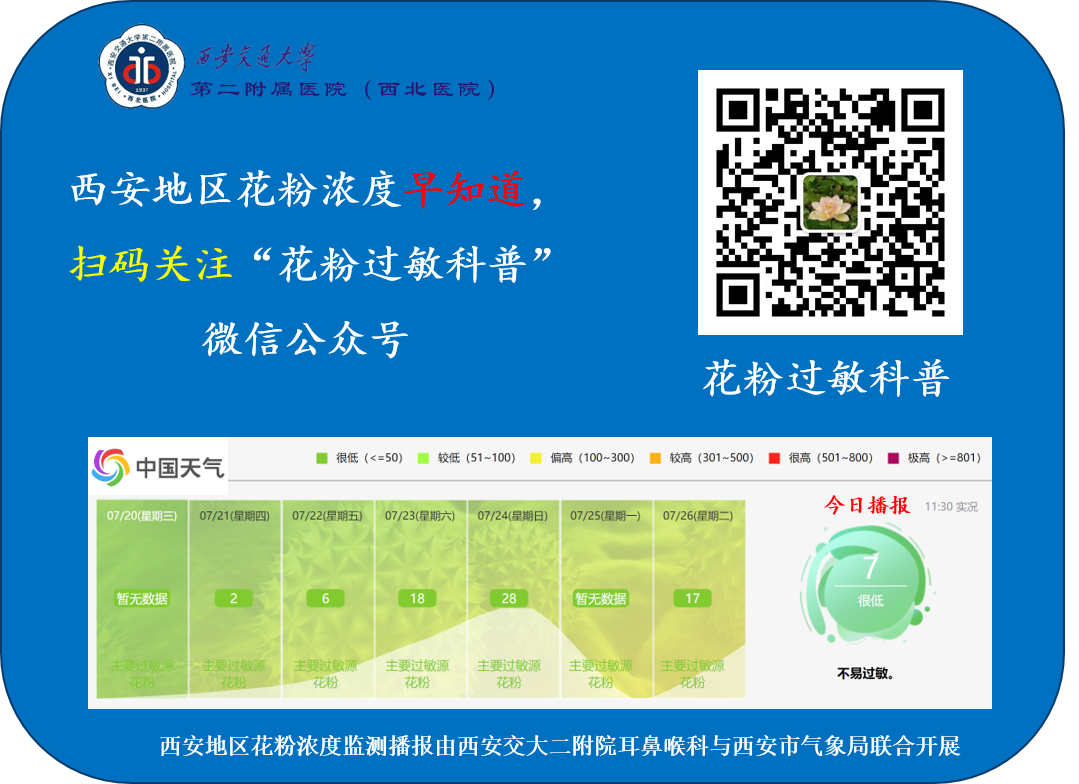 为了传播花粉过敏相关的科普知识,耳鼻咽喉头颈外科病院积极探索创新服务模式,建立了“花粉过敏科普”微信公众号,在花粉季节播报特定区域的花粉浓度监测实况,为花粉过敏患者的疾病防治提供科学依据,传播新的前沿的花粉过敏治疗方法。欢迎您的关注。