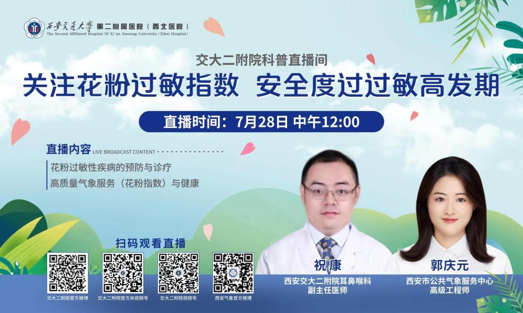 2022年7月28日中午12点,西安交通大学第二附属医院耳鼻咽喉头颈外科病院联合西安市公共气象服务中心开展了主题为“关注花粉过敏指数,安全度过过敏高发期”的科普直播活动。