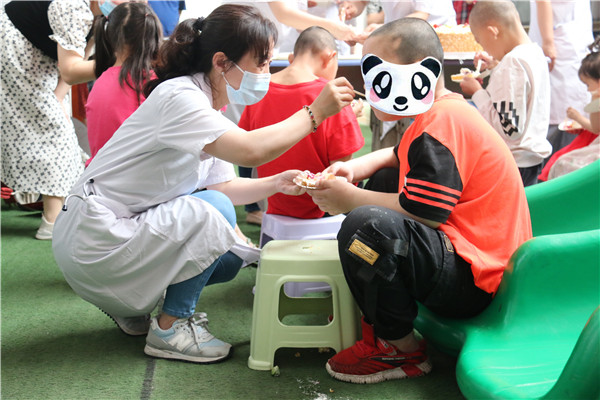 义诊结束后,大家与特教中心人员一起为孩子们切蛋糕,分发零食玩具,共同陪孩子们度过一个幸福快乐的儿童节。随后,在特教中心工作人员的带领下,大家进入特教儿童生活区及教室,详细询问孩子们生活学习情况,深入了解特教中心日常运作情况及面临的实际困难。